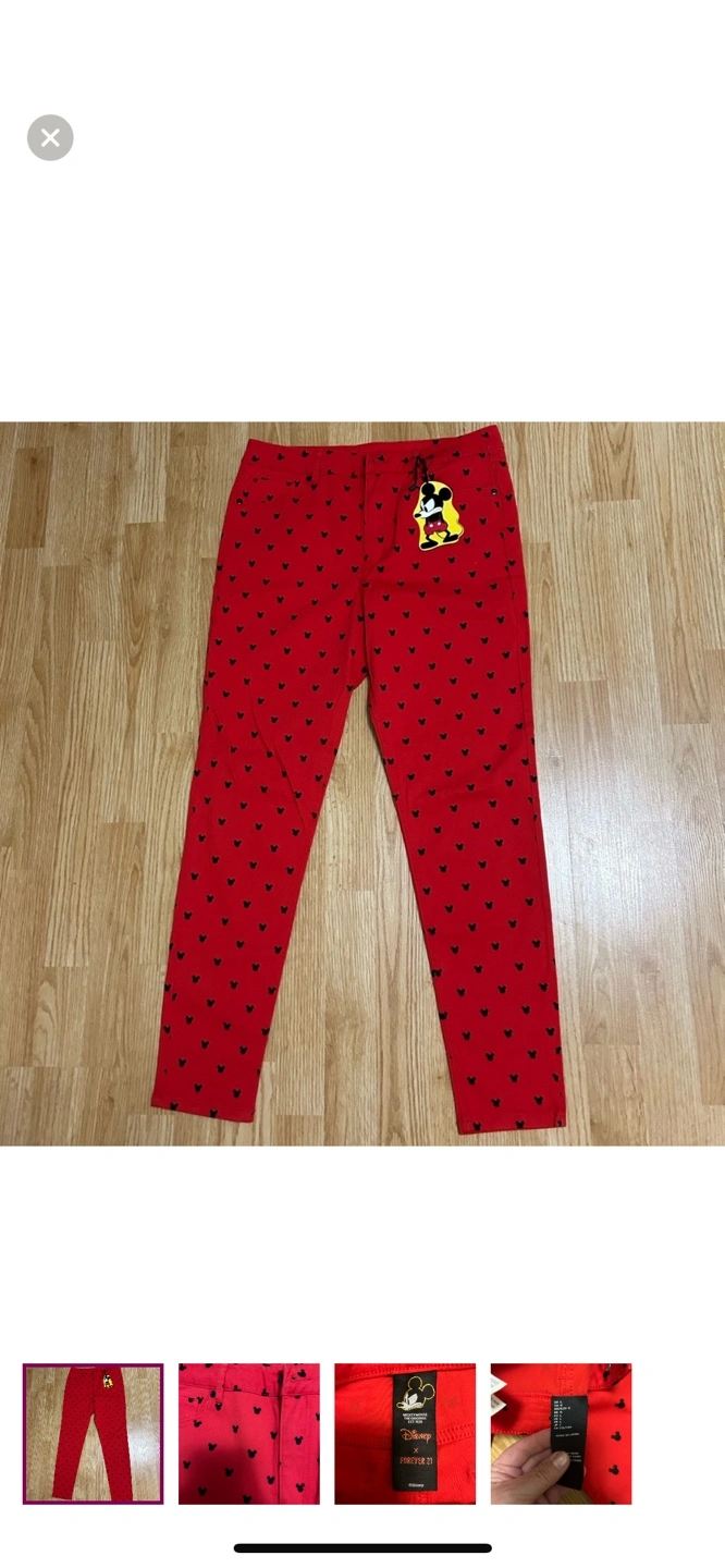 Red jeans featuring an all-over Mickey Mouse print. Size large. Made in China.