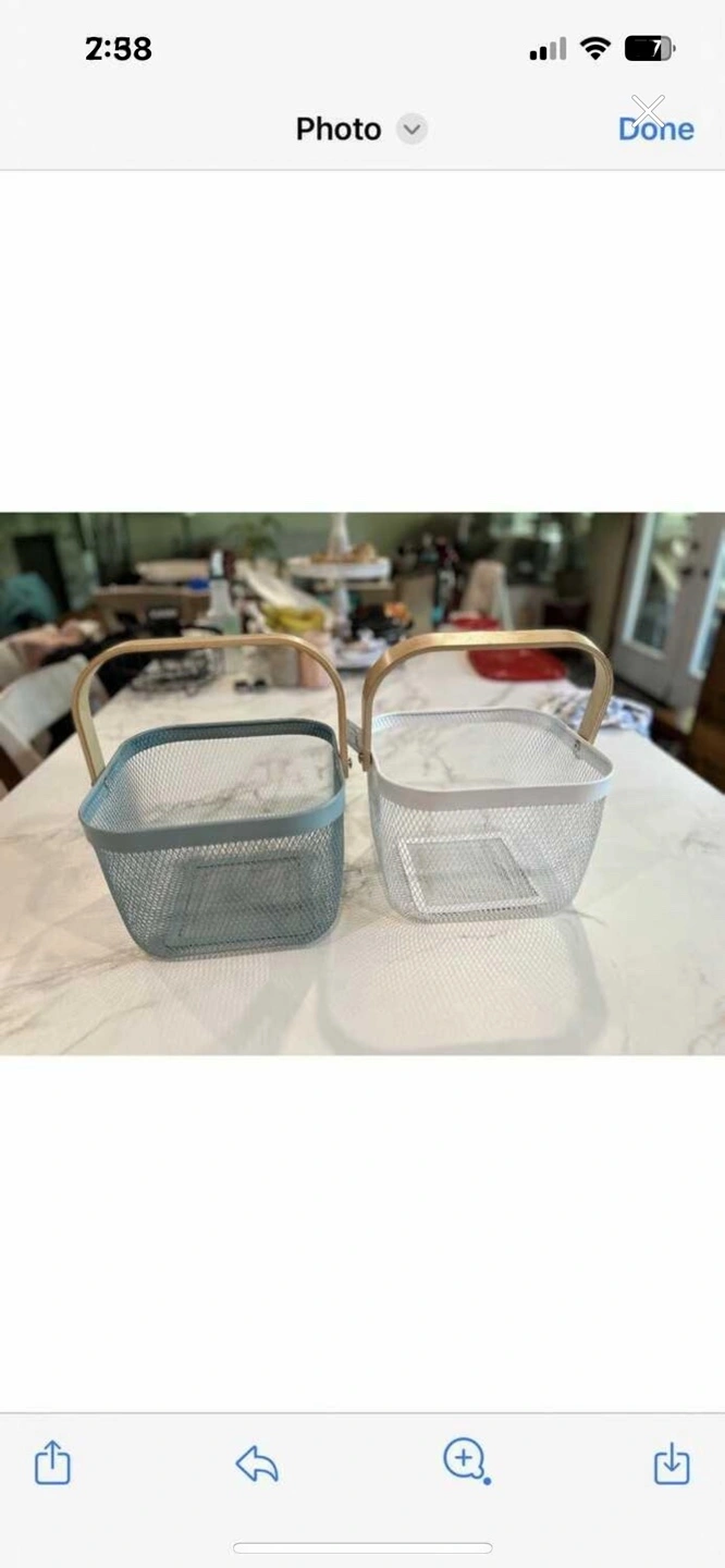 Two square wire baskets. Light teal and white colours. Gold-toned handles. Perfect for organizing.