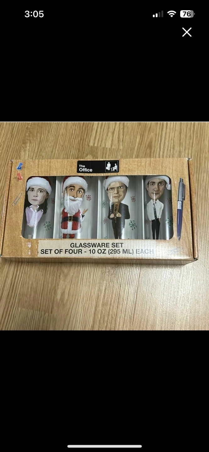 Set of four 10 oz glasses. Features characters from The Office dressed in holiday attire. New in box.