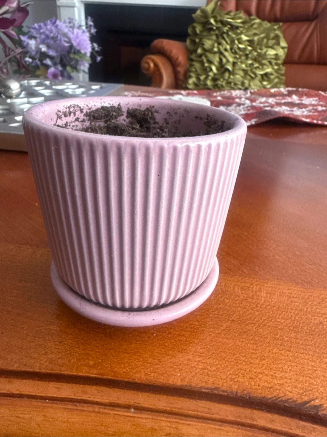 This pretty pink ceramic pot comes with a matching saucer. It's ready for your favourite small plant! The ribbed design adds a nice touch to any space.