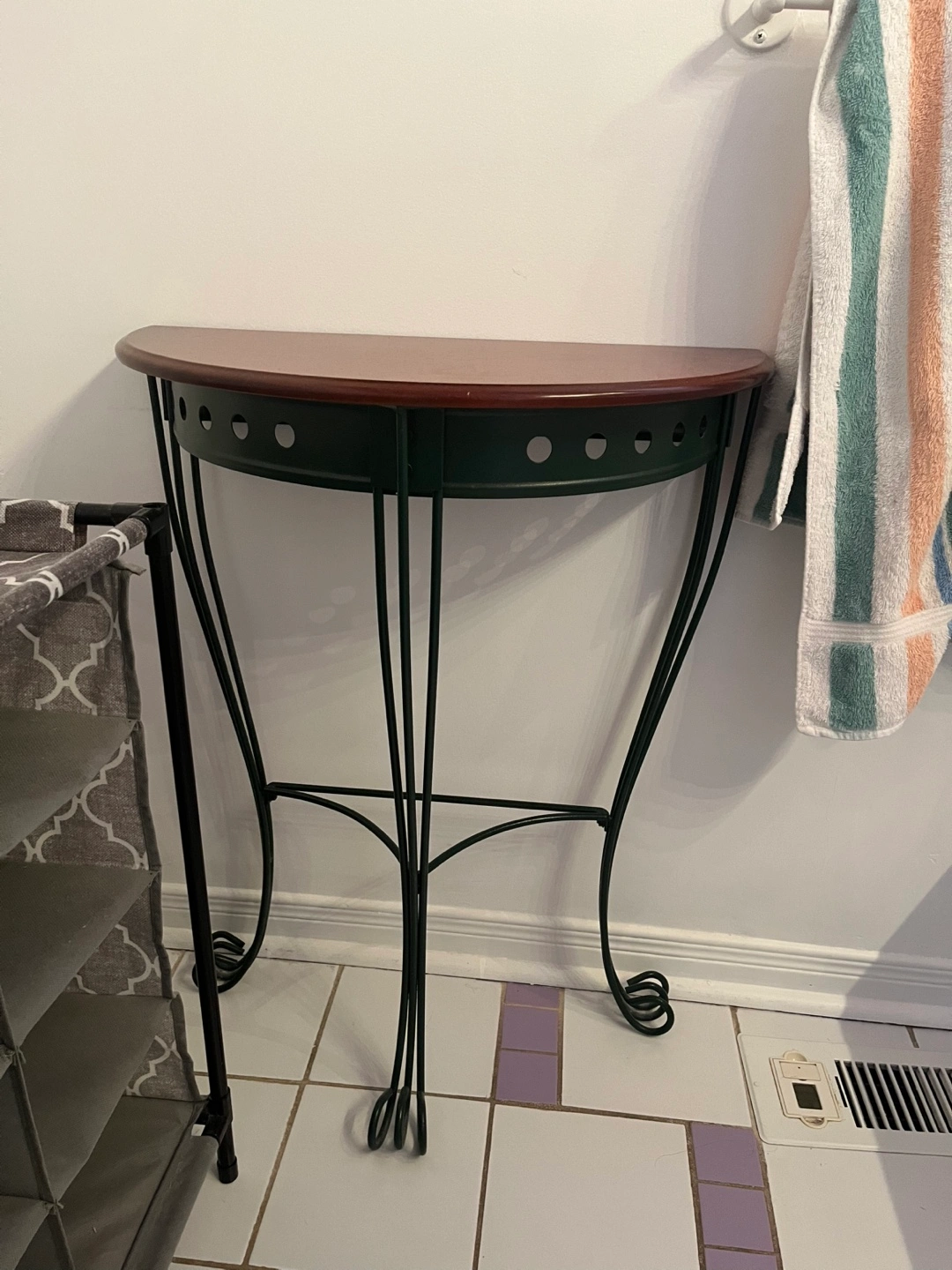 Buy & SellHalf-moon Console TableHalf-moon Console Table$10Dark brown wood top. Dark green metal base. Ornate scrollwork legs. Perfect for a small space. Some minor wear.WHERE TO MEETVaughanView MapSELLERChantelleRural Vaughan232 reviews0 chats·0 favorites·20 views