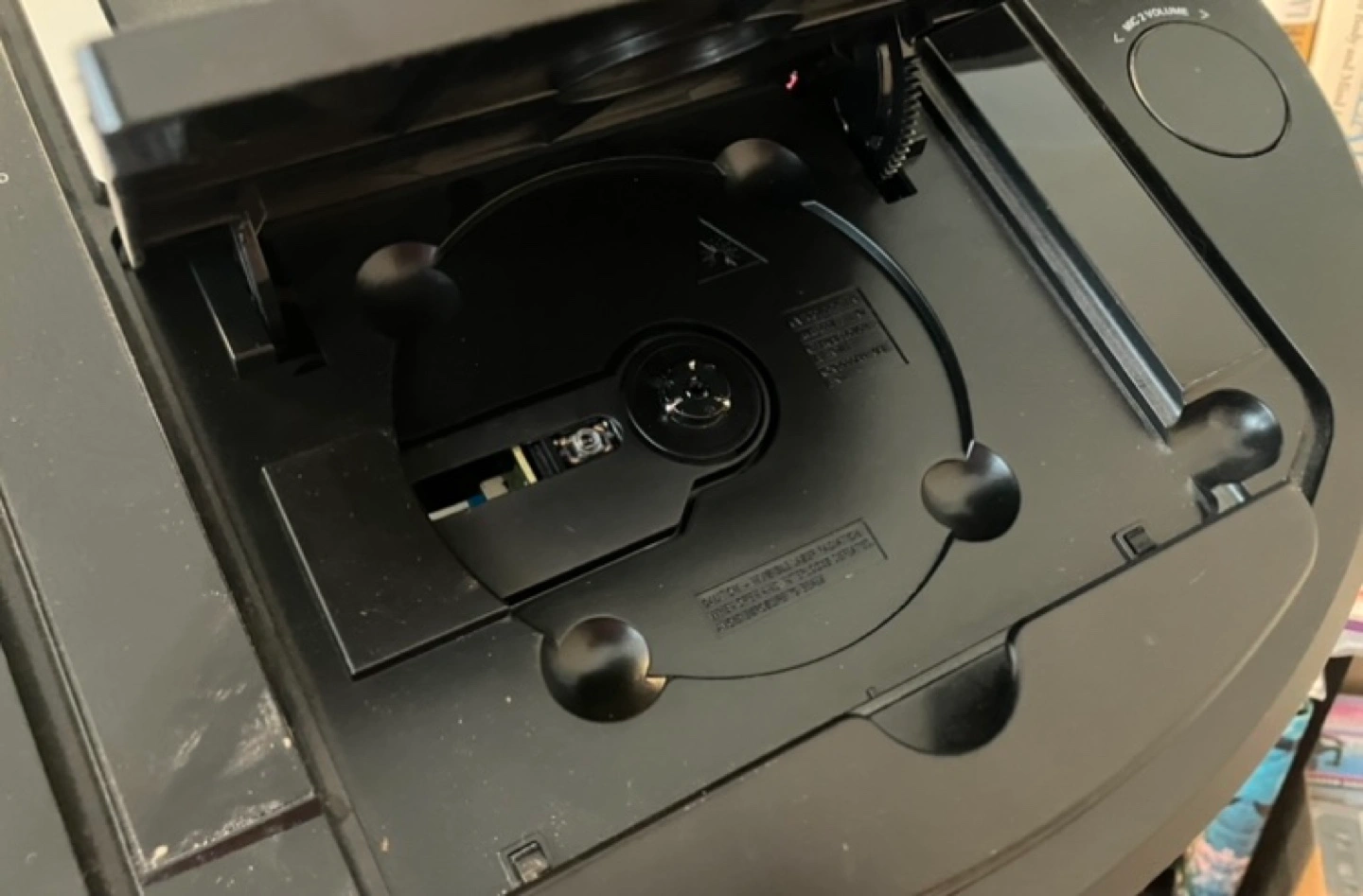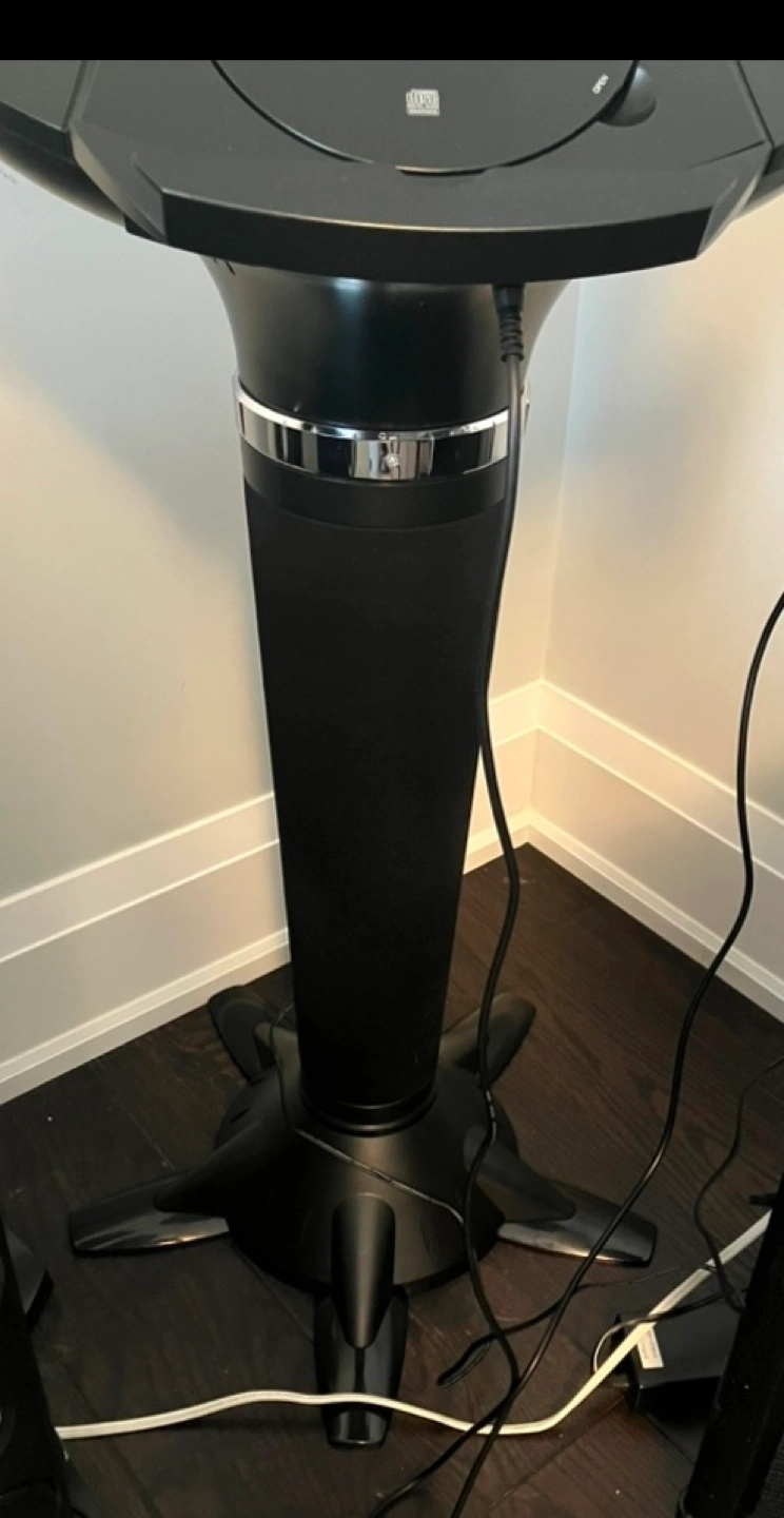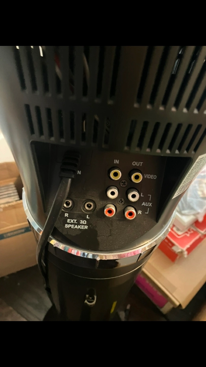 Karaoke machine and microphone. Features a CD player, USB input, and screen. Includes various input/output ports. Floor standing model. Use with your own speakers.