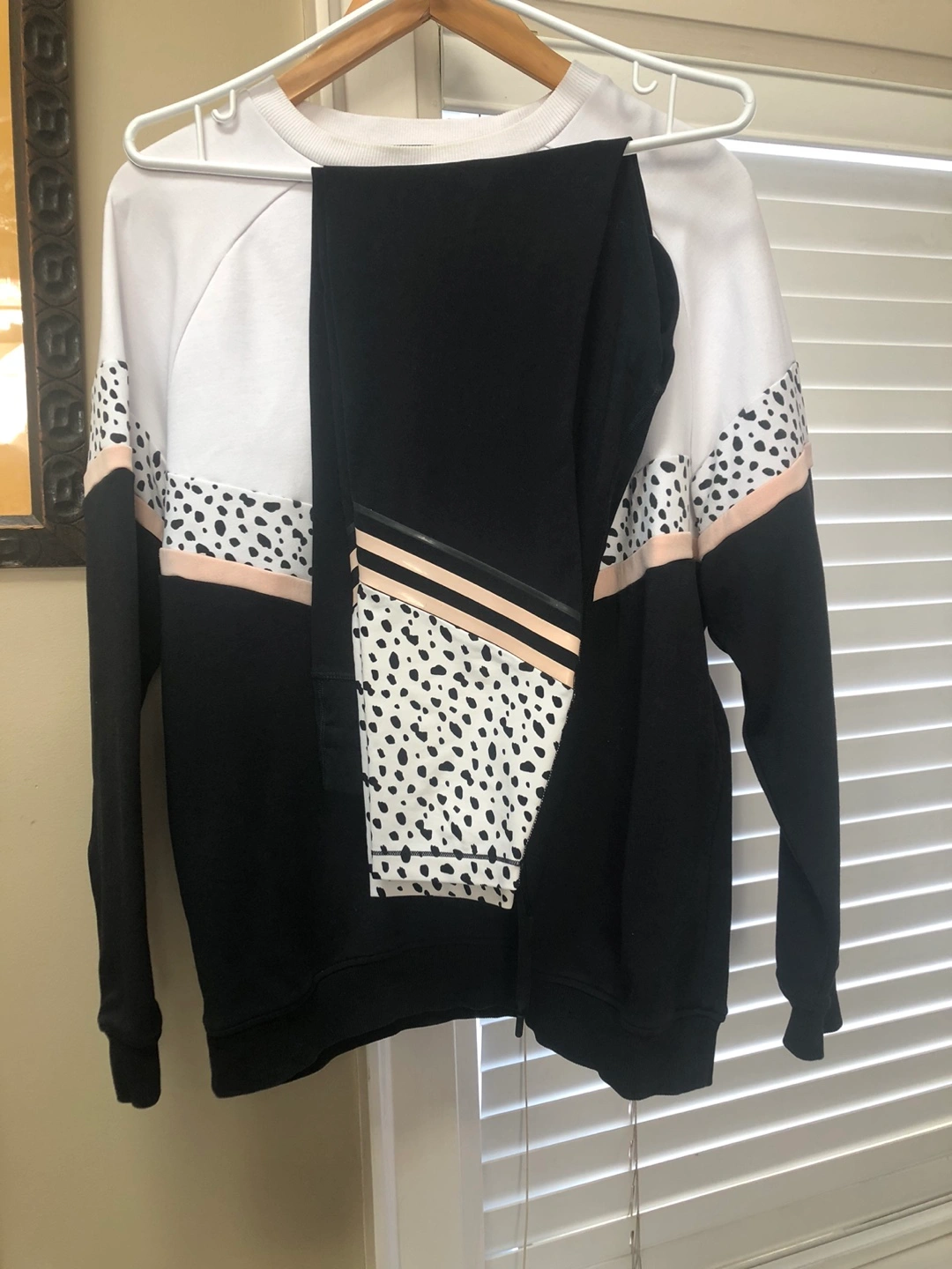 Matching set includes black leggings with a print detail at the ankle and a matching crewneck sweatshirt. Leggings have NEVER BEEN WORN and feature a drawstring waistband. Comfortable and stylish athletic wear. Sweatshirt could use a wash/bleach around the neck and on one spot on the back (see pictures). Yonge/Davisville pick up. From smoke-free/pet-free home.