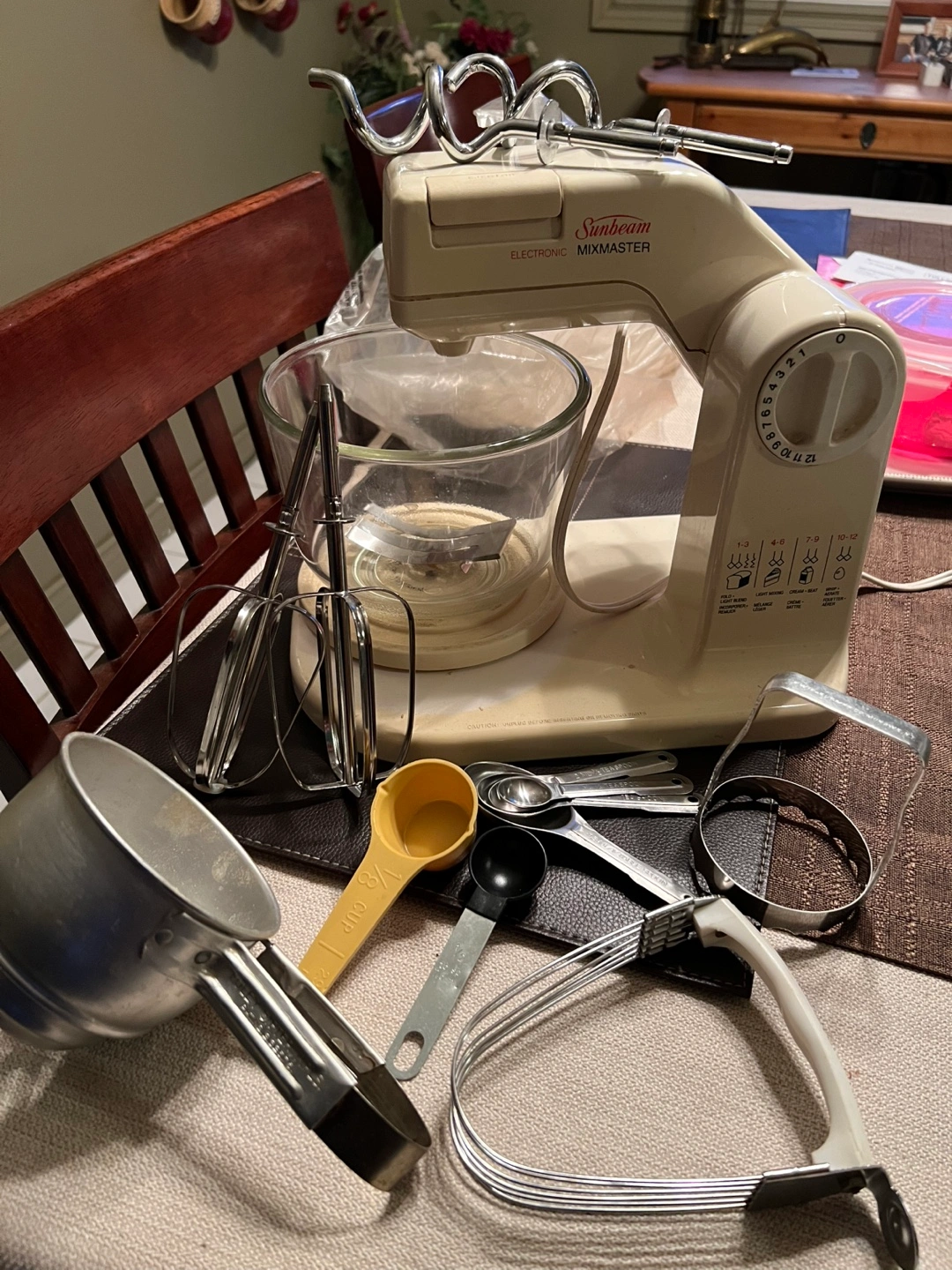 Vintage Sunbeam Mixmaster electronic stand mixer. Includes various attachments: beaters, dough hooks, measuring cups and spoons, sifter, and more. Great for baking!