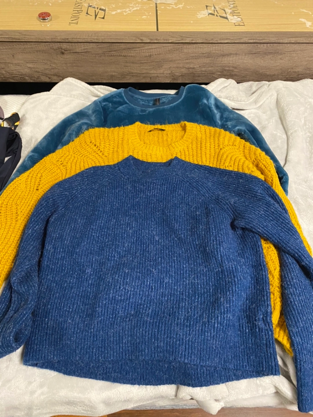 2–blue, 1–mustard yellow . Various styles and materials. All size large, all 3–for $8.00
