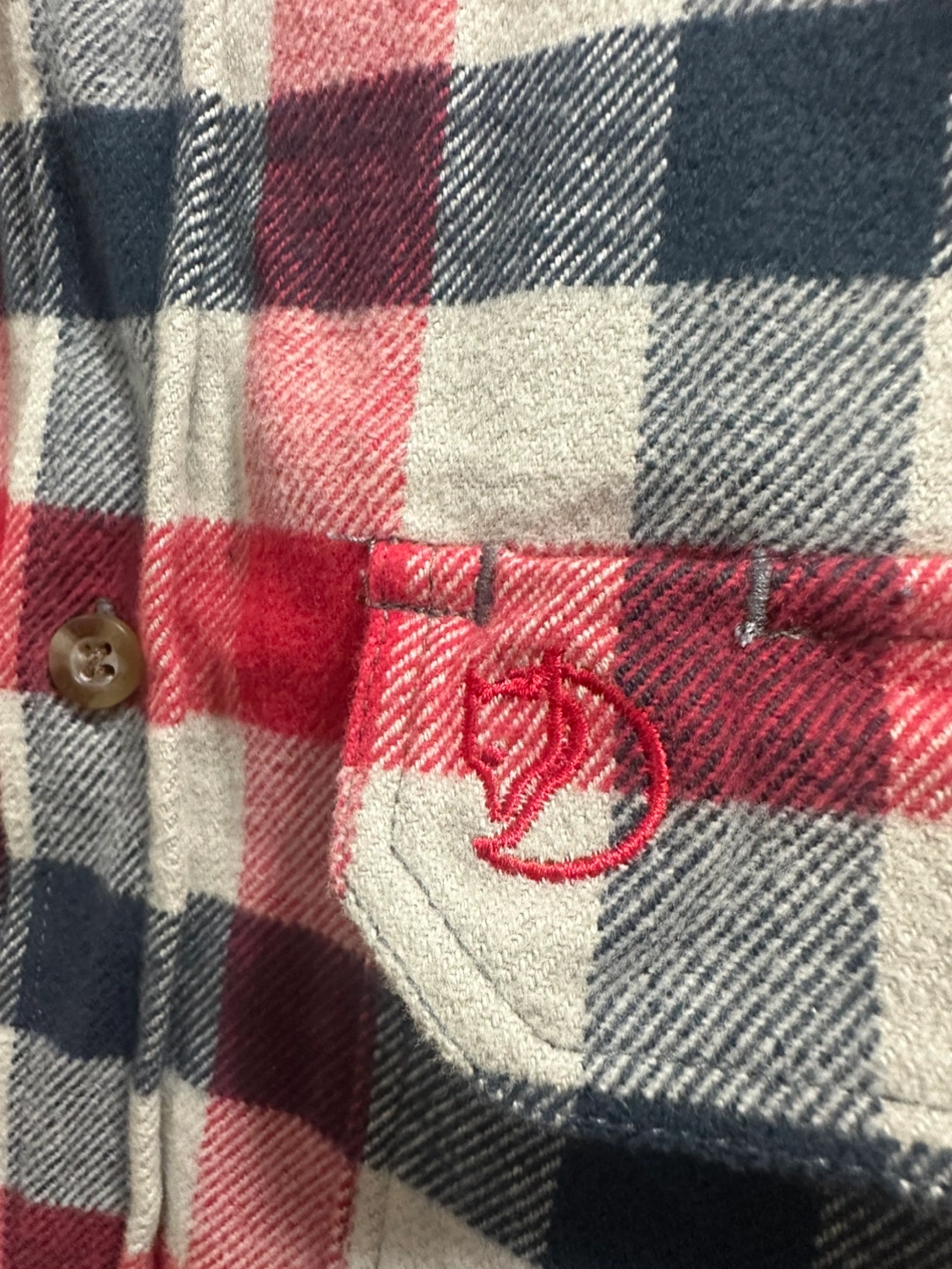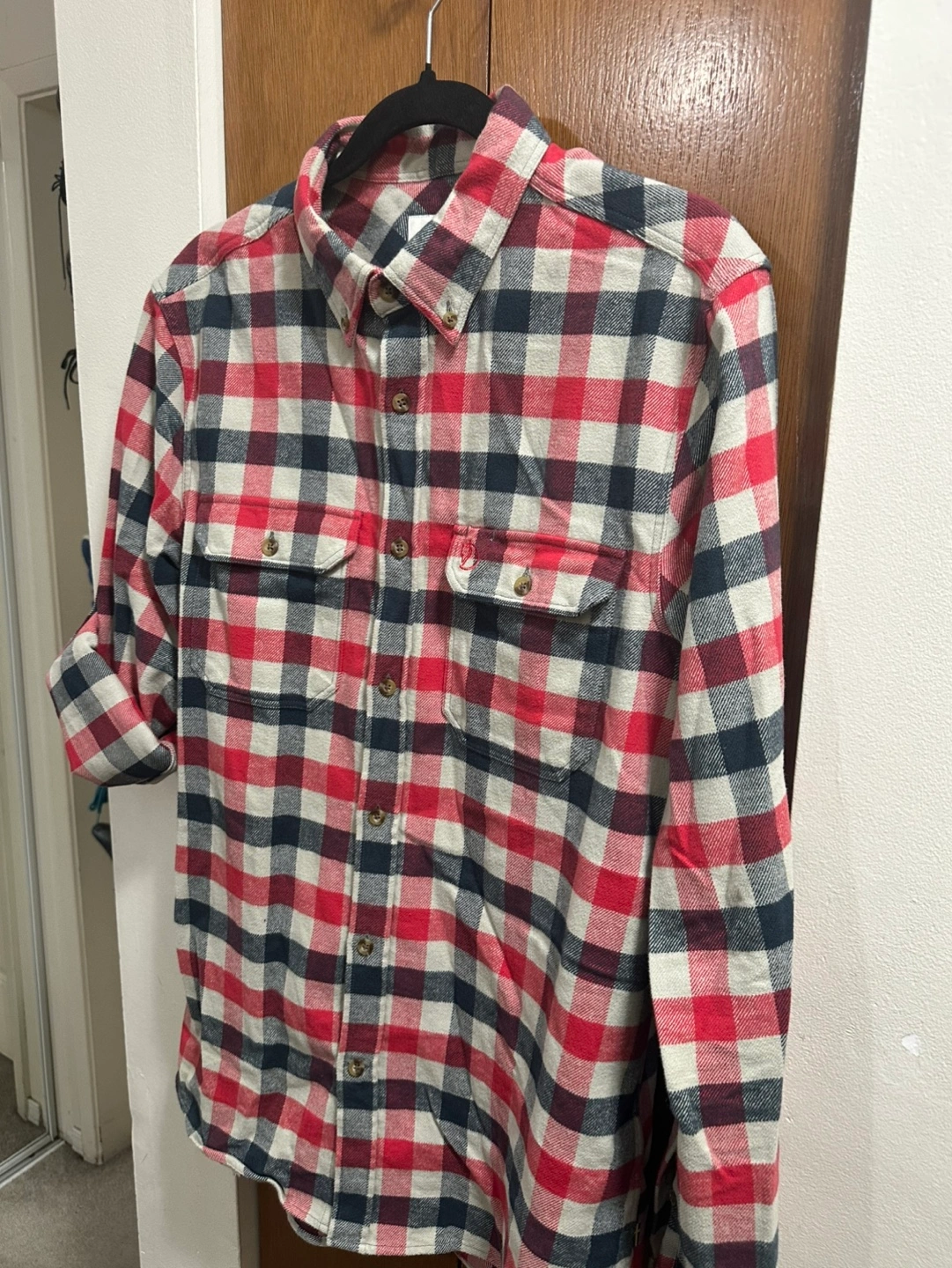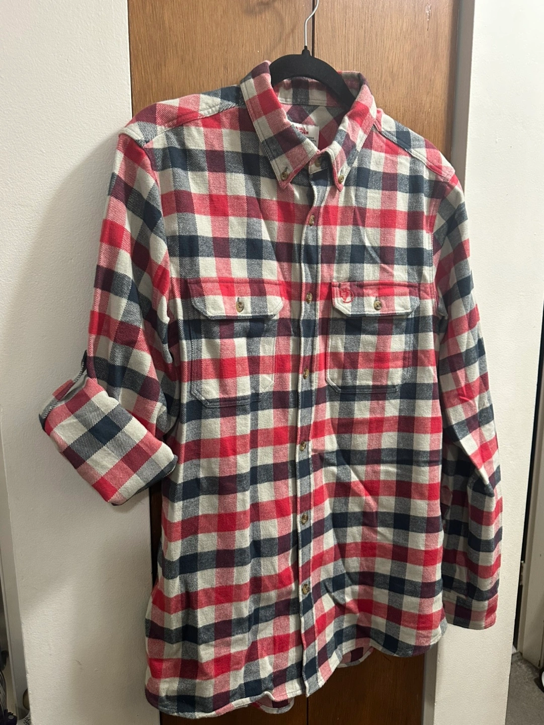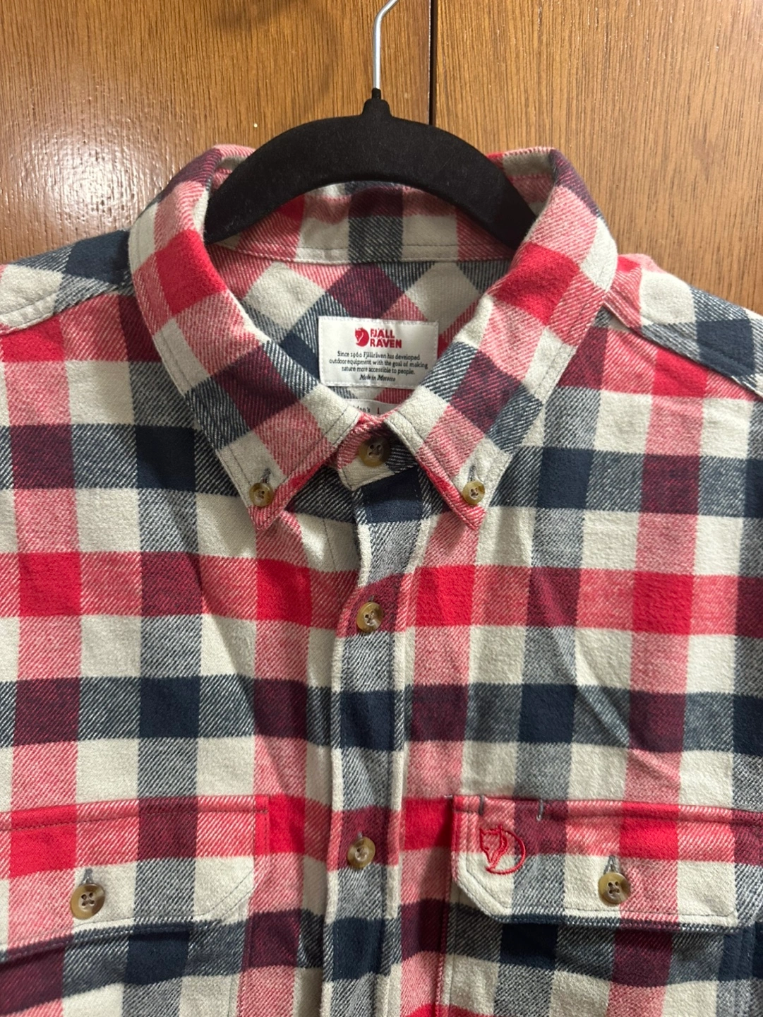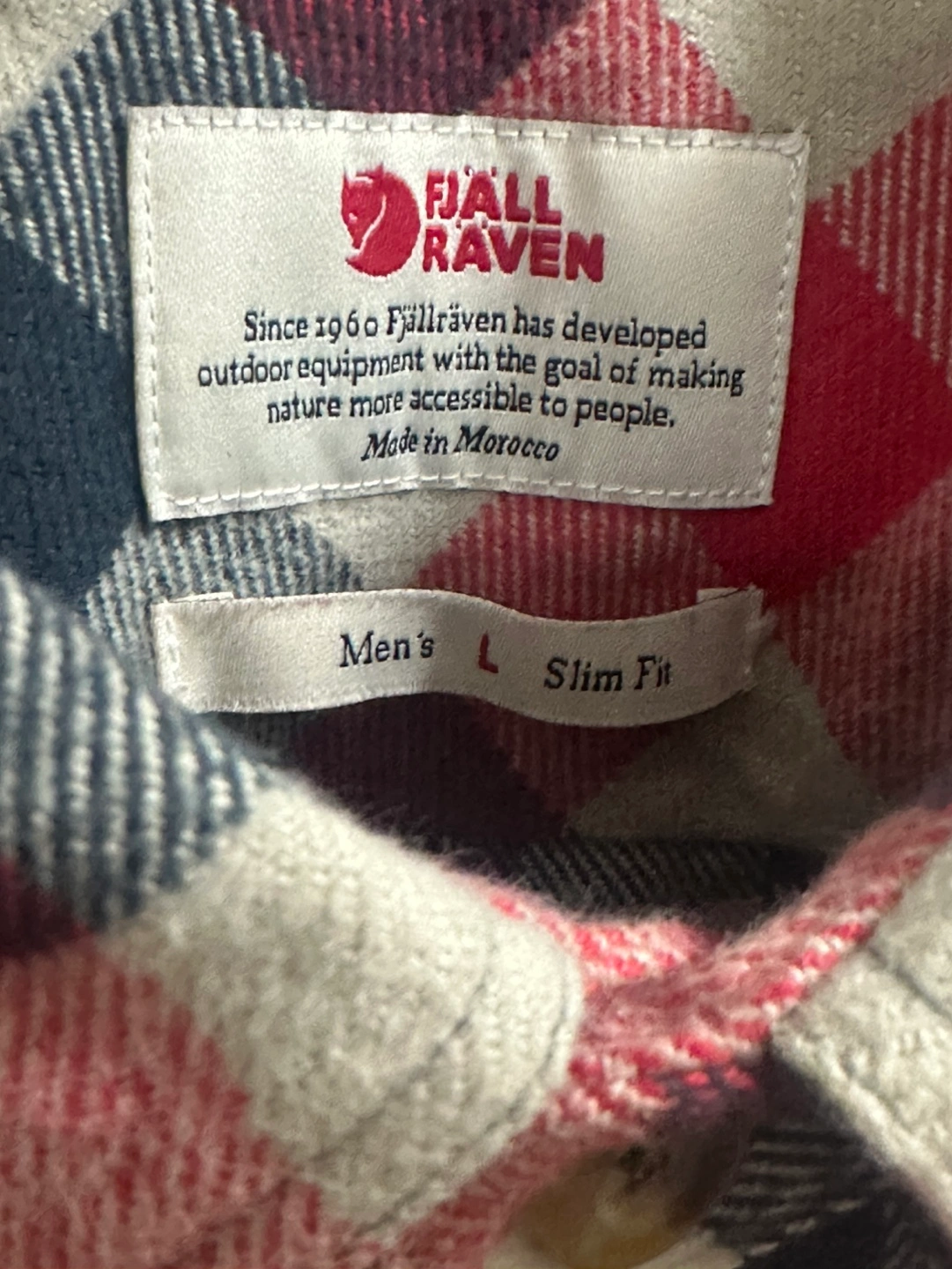 Men's Fjällräven flannel shirt. Size large, slim fit. Red, black, and cream plaid pattern. Long sleeves, button-down closure. Two chest pockets. Made in Morocco.