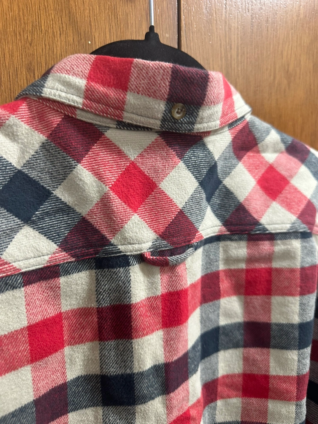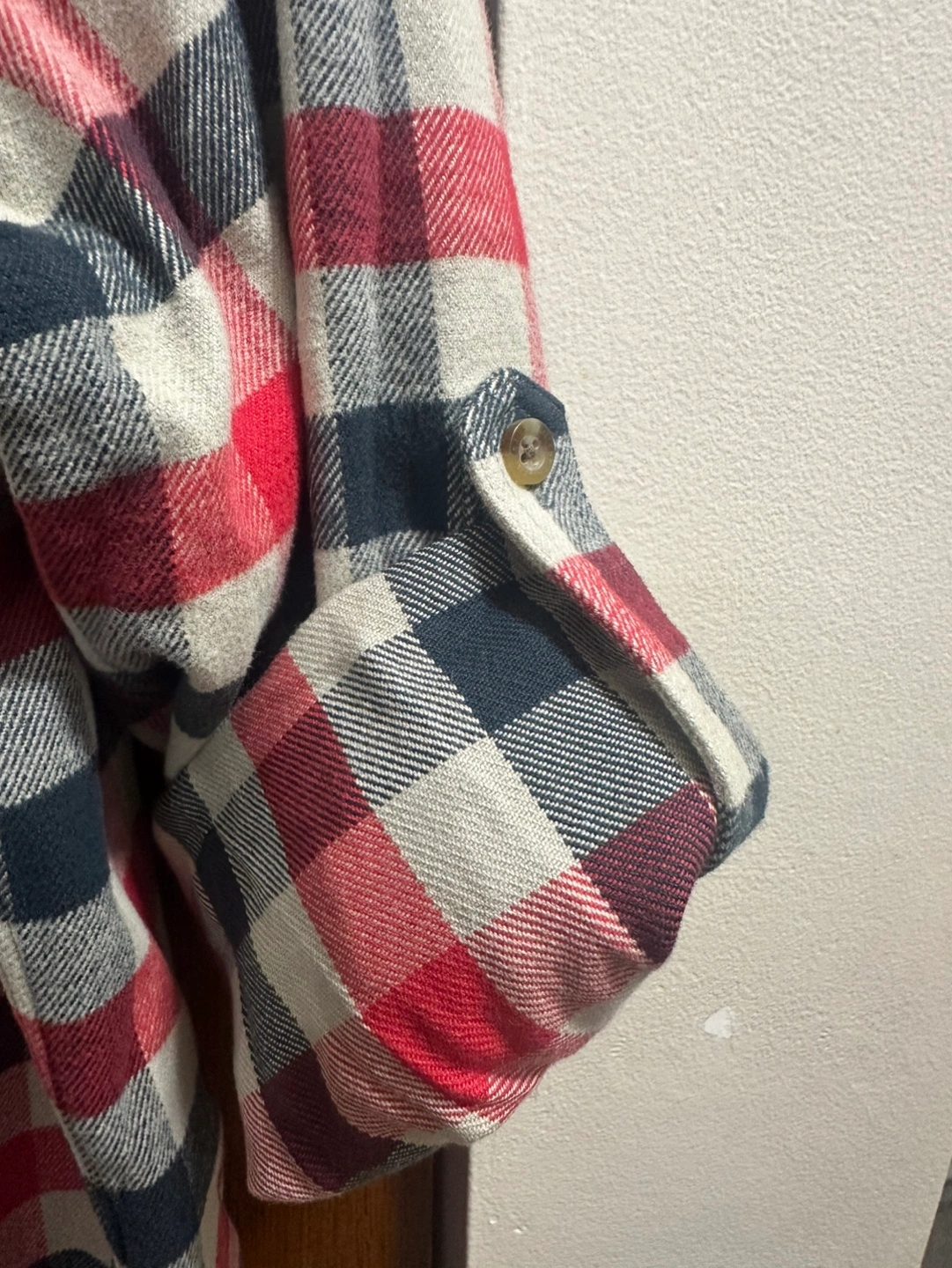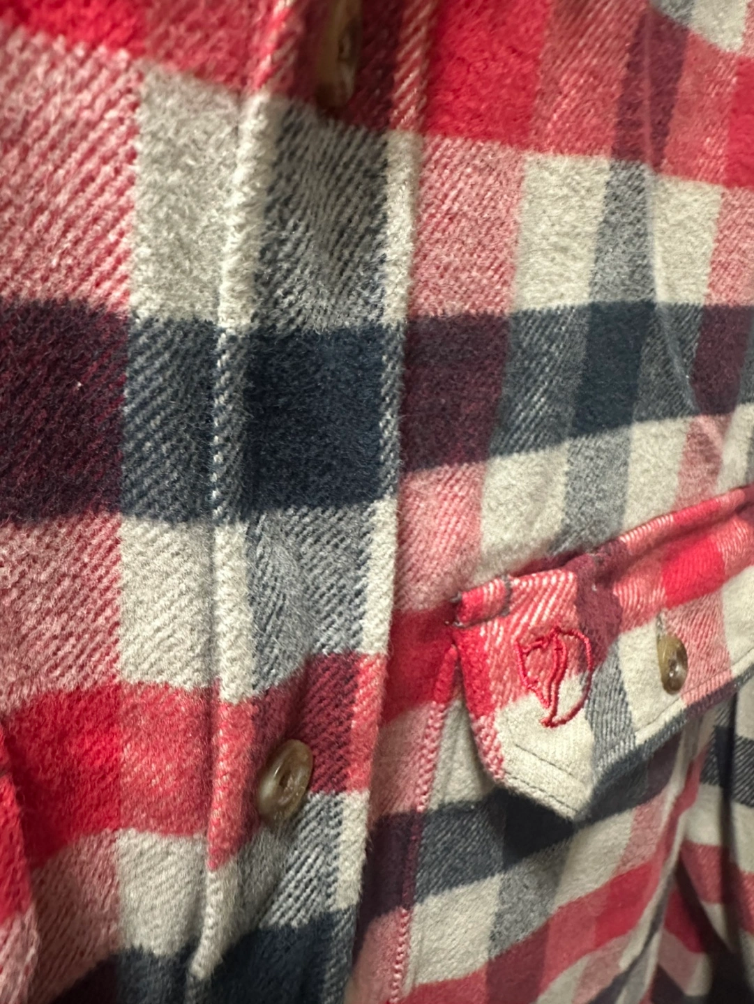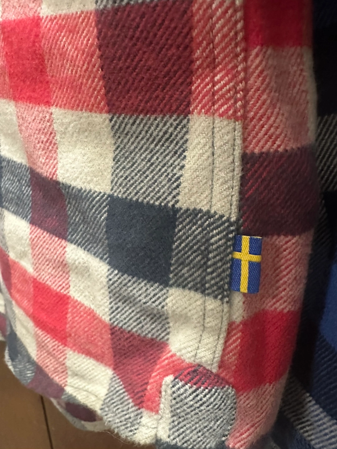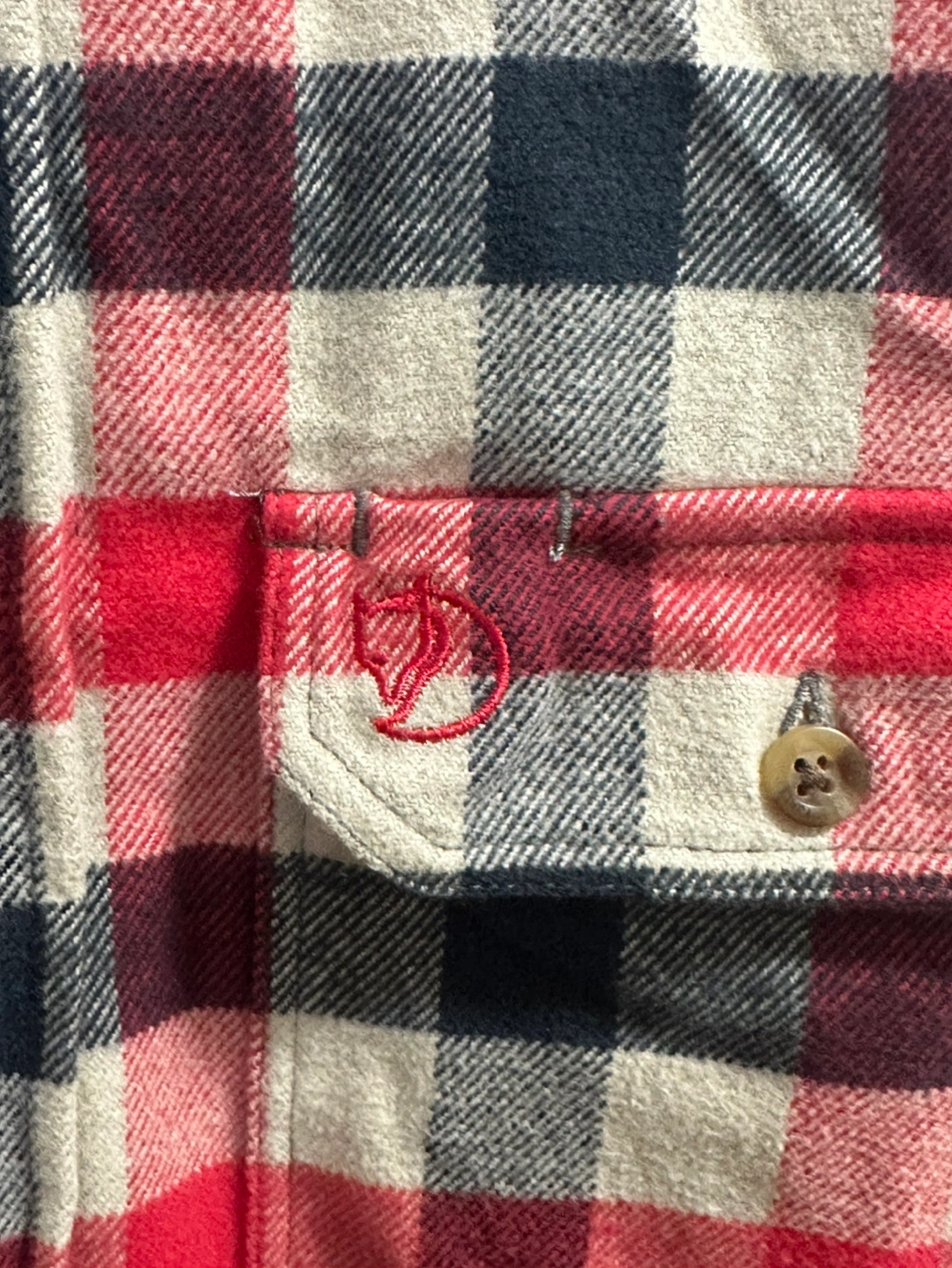 Men's Fjällräven flannel shirt. Size large, slim fit. Red, black, and cream plaid pattern. Long sleeves, button-down closure. Two chest pockets. Made in Morocco.