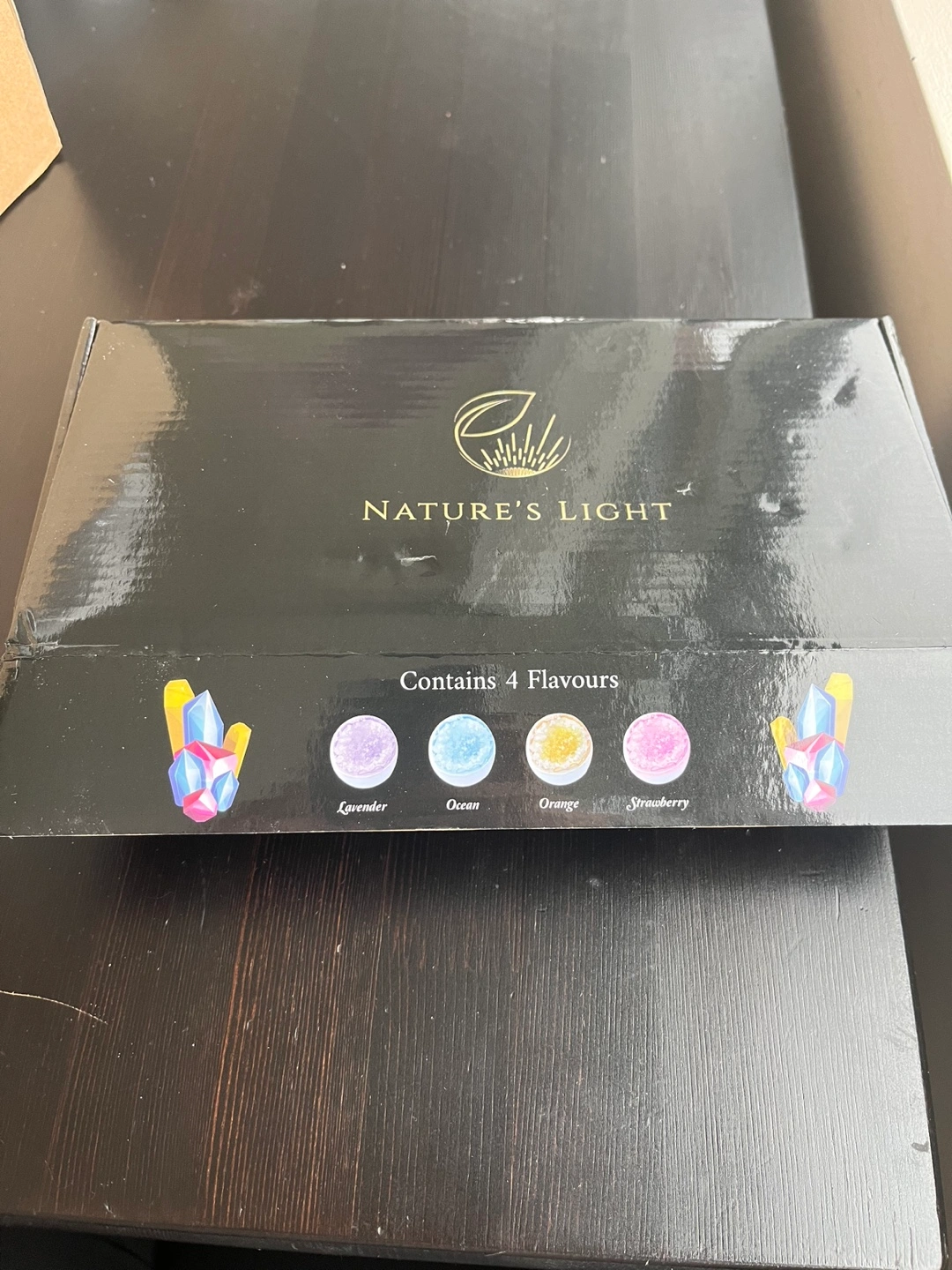 Eight bath bombs, four different scents: lavender, ocean, orange, and strawberry. Comes in a black gift box. Perfect for relaxing bath time.