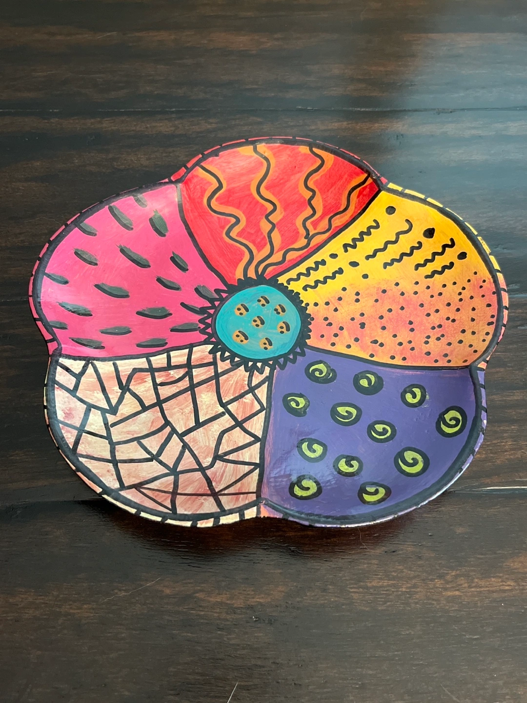 Unique flower-shaped decorative plate. Limited series. Hand-painted. Canadian made. Vibrant colours and patterns. Great for displaying or as a small serving dish.