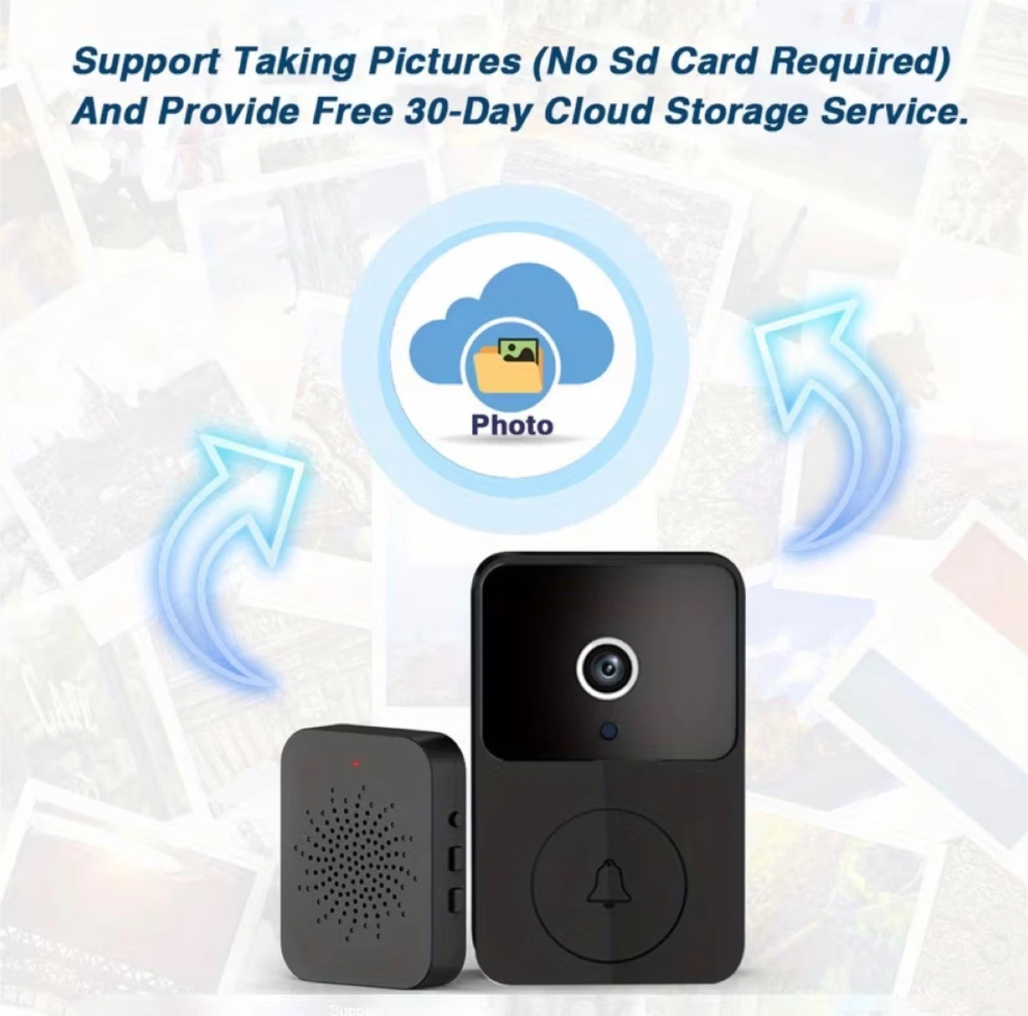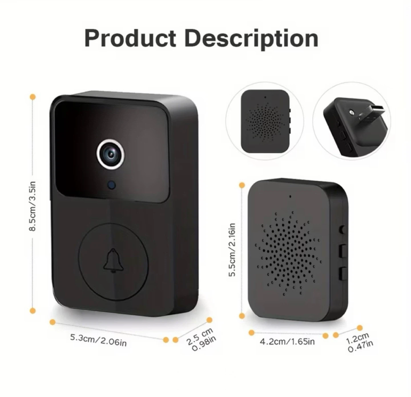 HD video resolution lets you see clearly day and night. This doorbell supports taking pictures with free 30-day cloud storage. The doorbell unit measures 8.5cm x 5.3cm x 2.5cm and the chime unit measures 5.5cm x 4.2cm x 1.2cm.