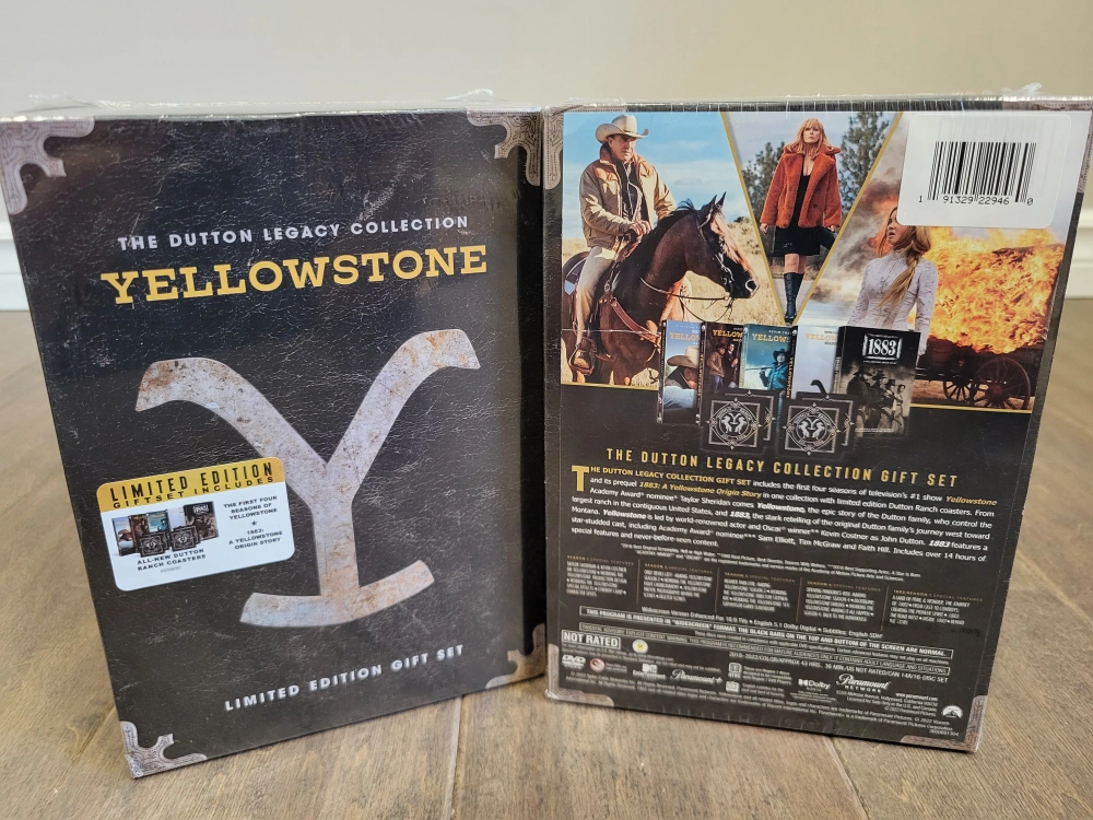 Limited edition gift set. Includes first four seasons of Yellowstone and its prequel 1883. Features special coasters. DVD format. New, unopened. $60 firm each, only 1 set left.