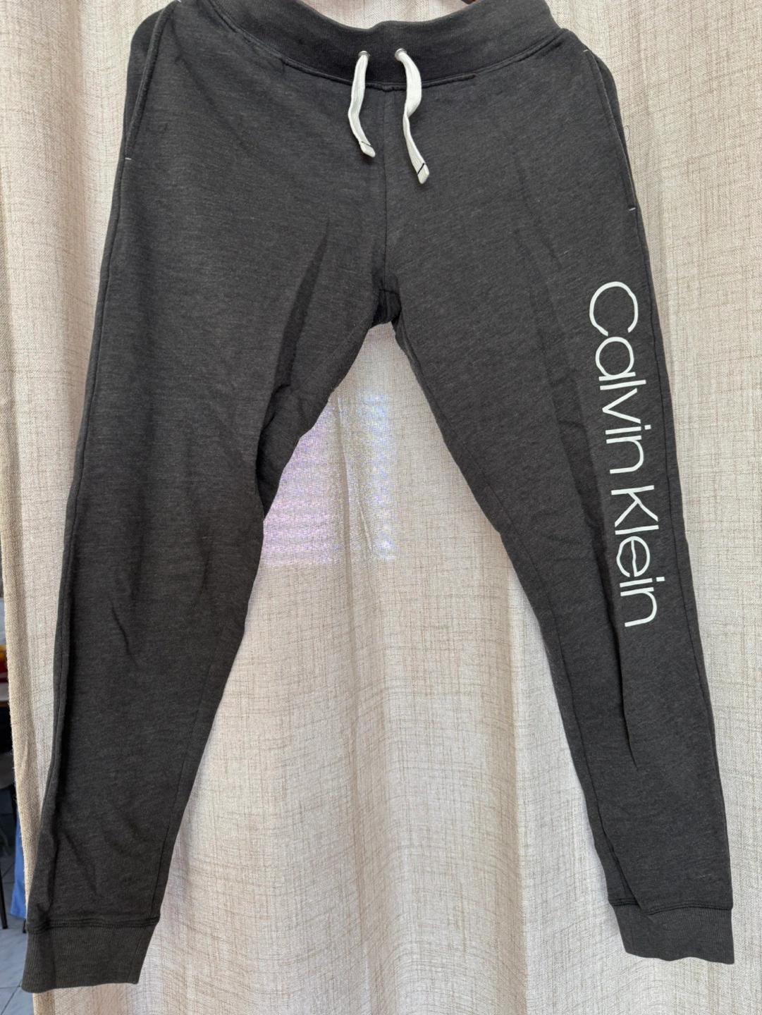 Dark grey joggers. Features an elastic waistband with drawstring. Calvin Klein logo on one leg. Excellent for lounging or working out.