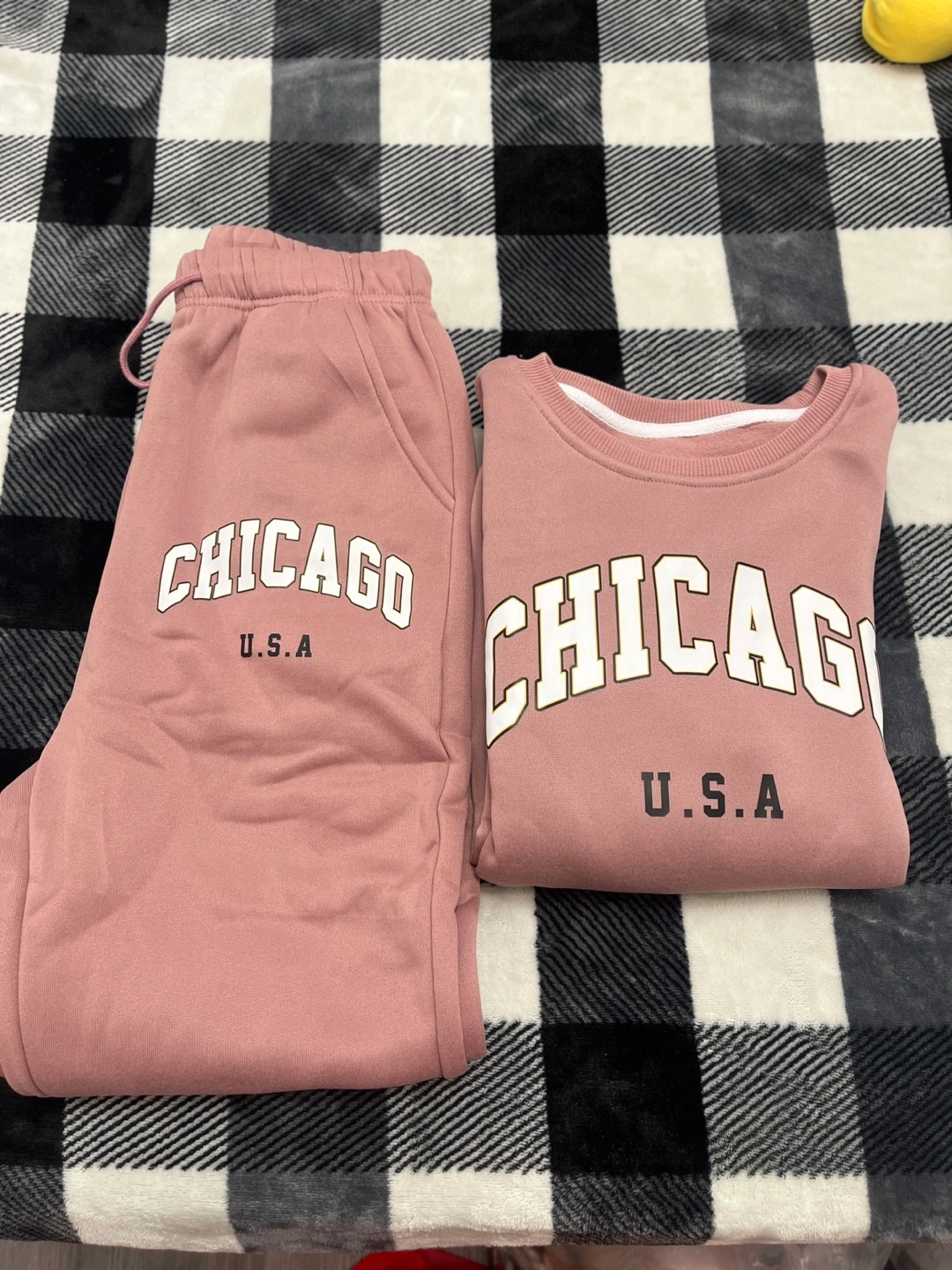 Women's dusty rose two-piece lounge set. Includes matching crewneck sweatshirt and jogger pants. Features 'CHICAGO U.S.A' graphic print. Comfortable and stylish.