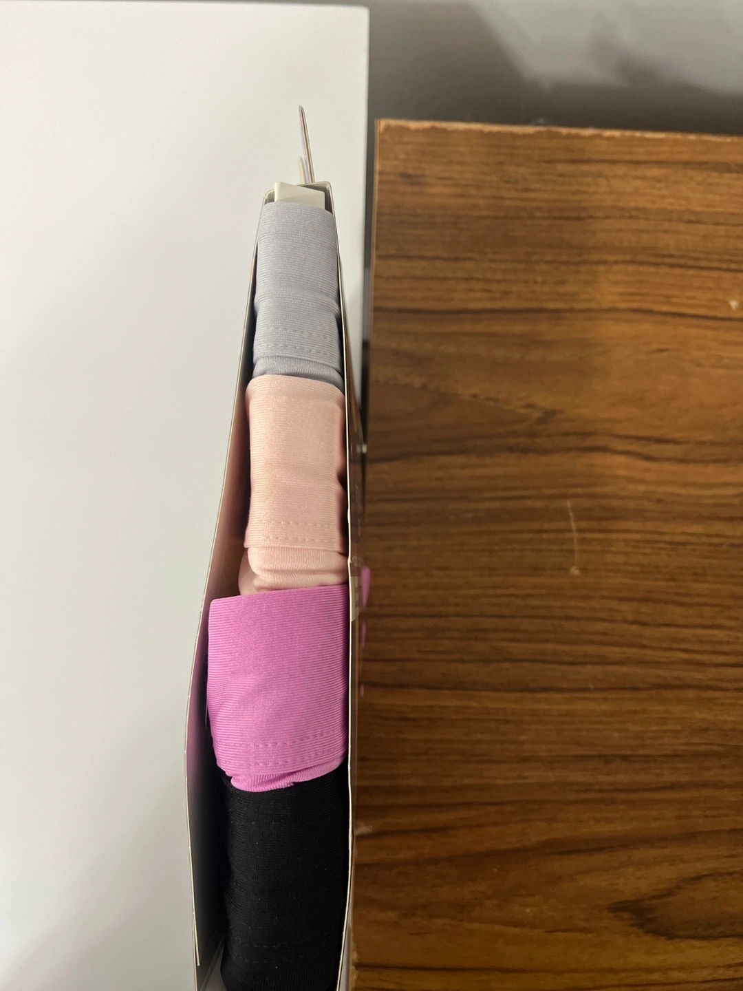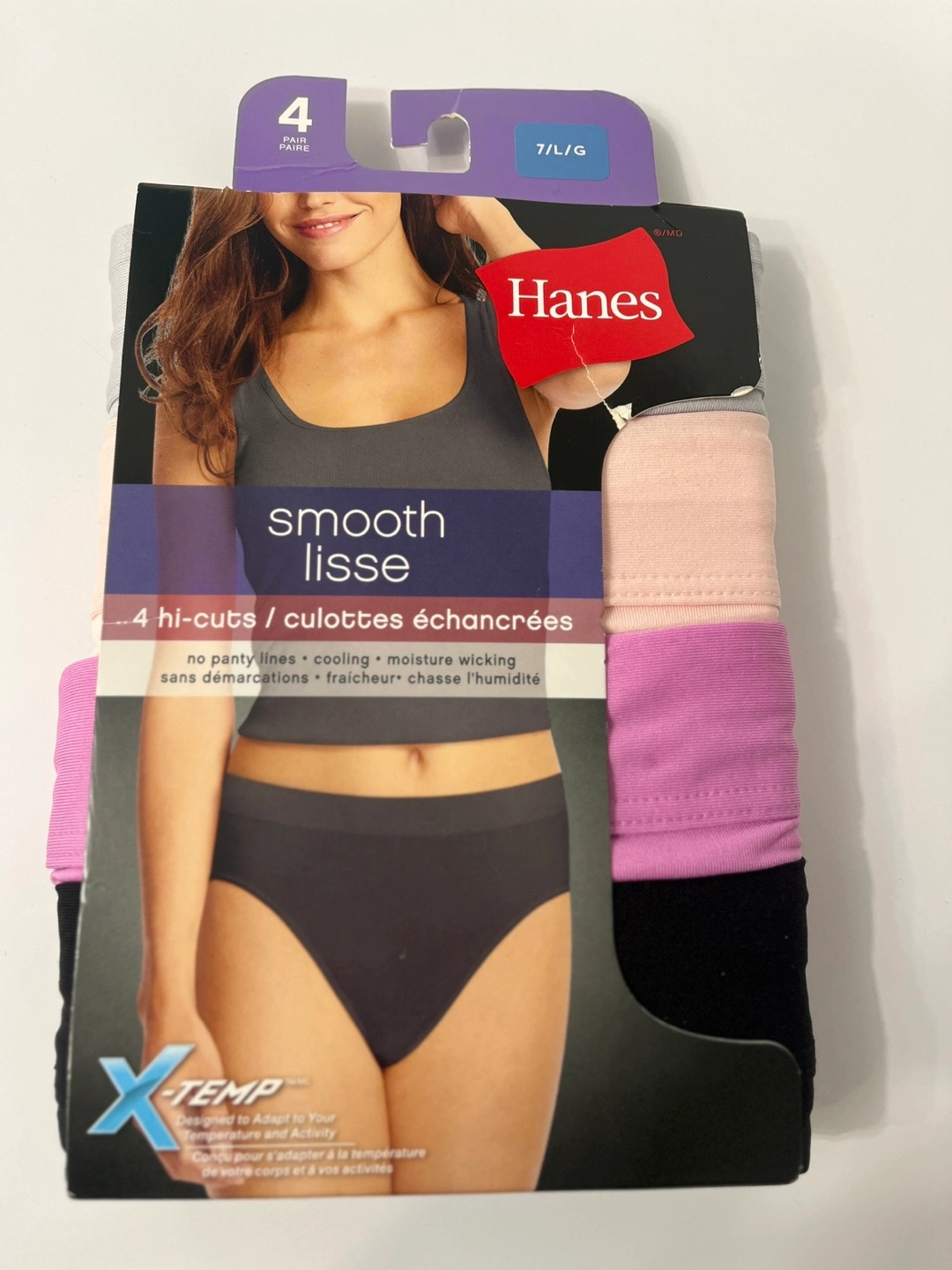 New Hanes smooth hi-cut underwear. Four-pack includes colours: grey, light pink, purple, and black. Moisture-wicking fabric. Invisible under clothes. Size 7/L/G.