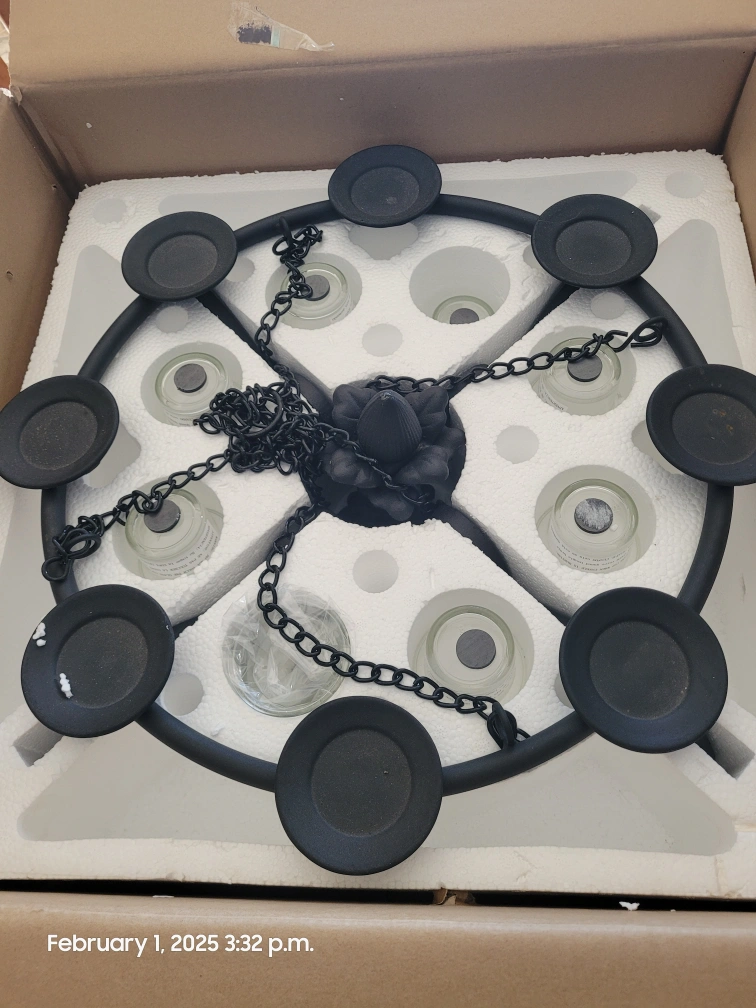 Black metal candle chandelier. Hangs from a chain. Includes six glass candle holders. New in box.
