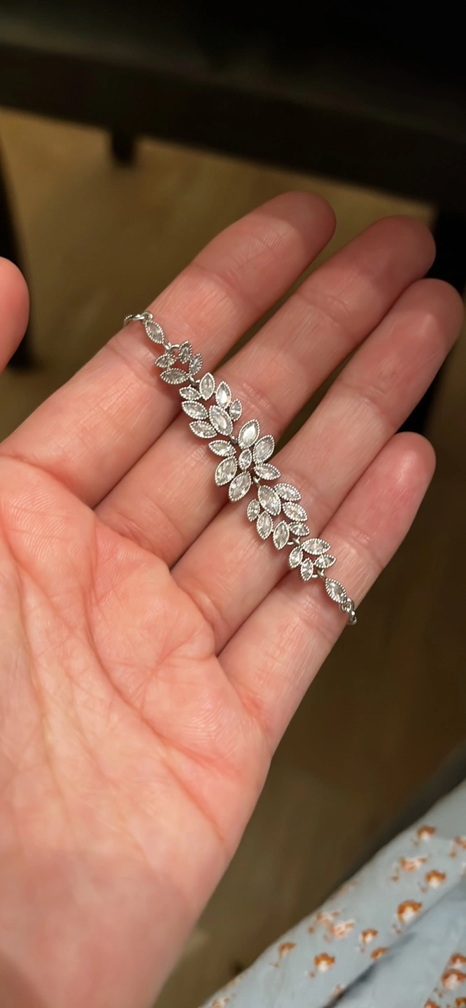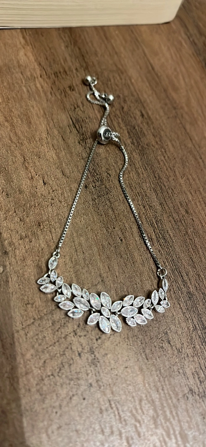 Beautiful adjustable bracelet. Features clear cubic zirconia stones in a floral design. Silver-toned chain and clasp. Looks great dressed up or down.