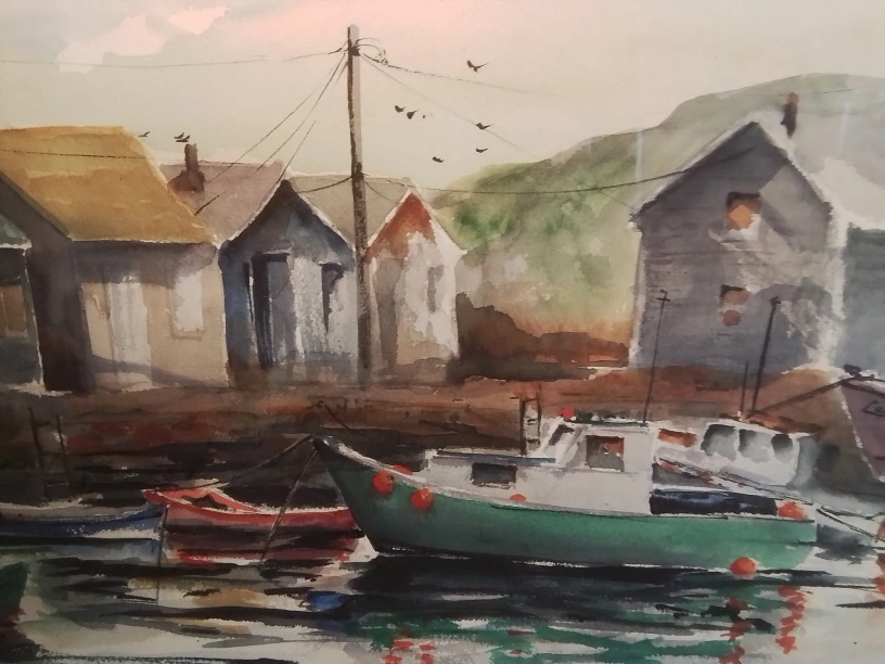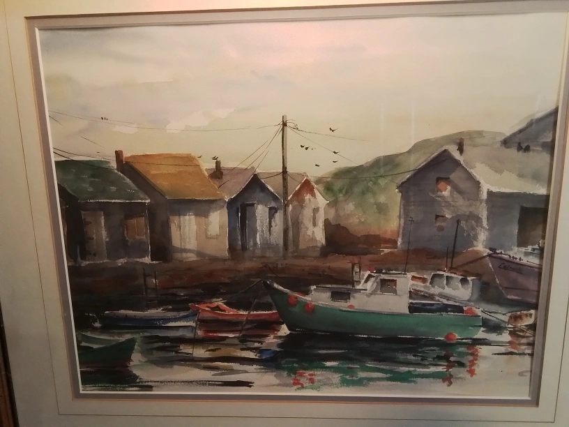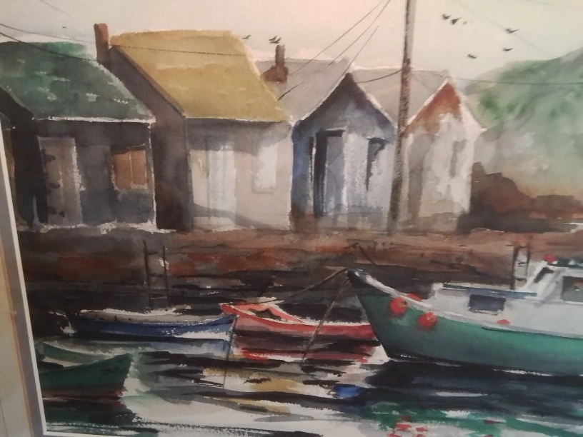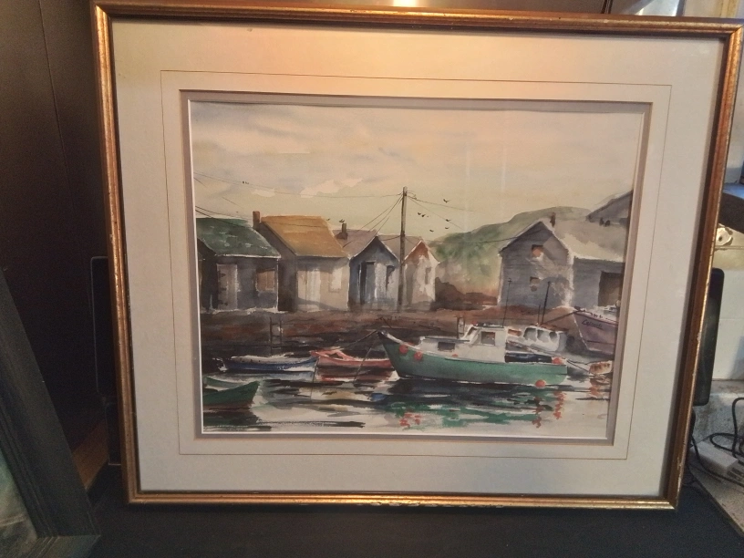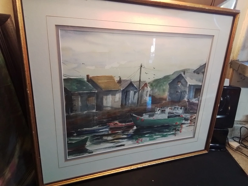 114Framed Harbour Scene Watercolour Painting 25" Artist Signed Cafnaski Framed watercolour painting of harbour scene Beautiful framed watercolour painting. Depicts a harbour scene with boats and buildings. Gold coloured frame. Looks like a coastal setting. Sound no issues Measurements: Frame 25" x 21" with painting 18" x 14" Pickup at Young Street and Steels Ave