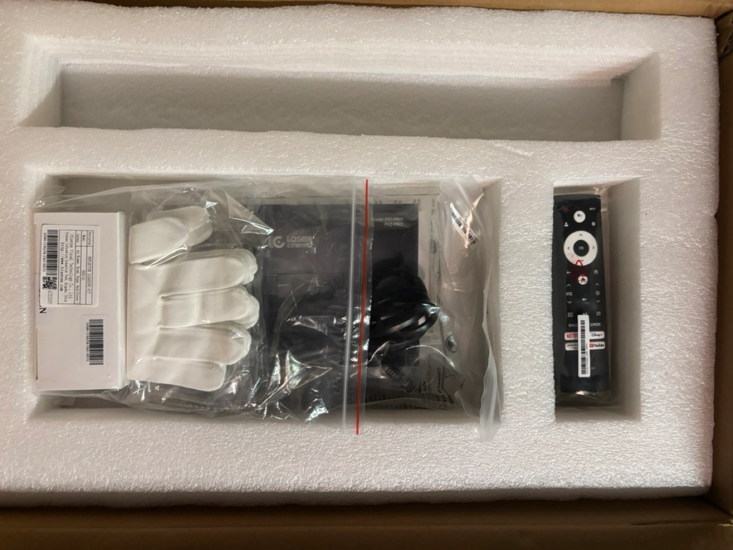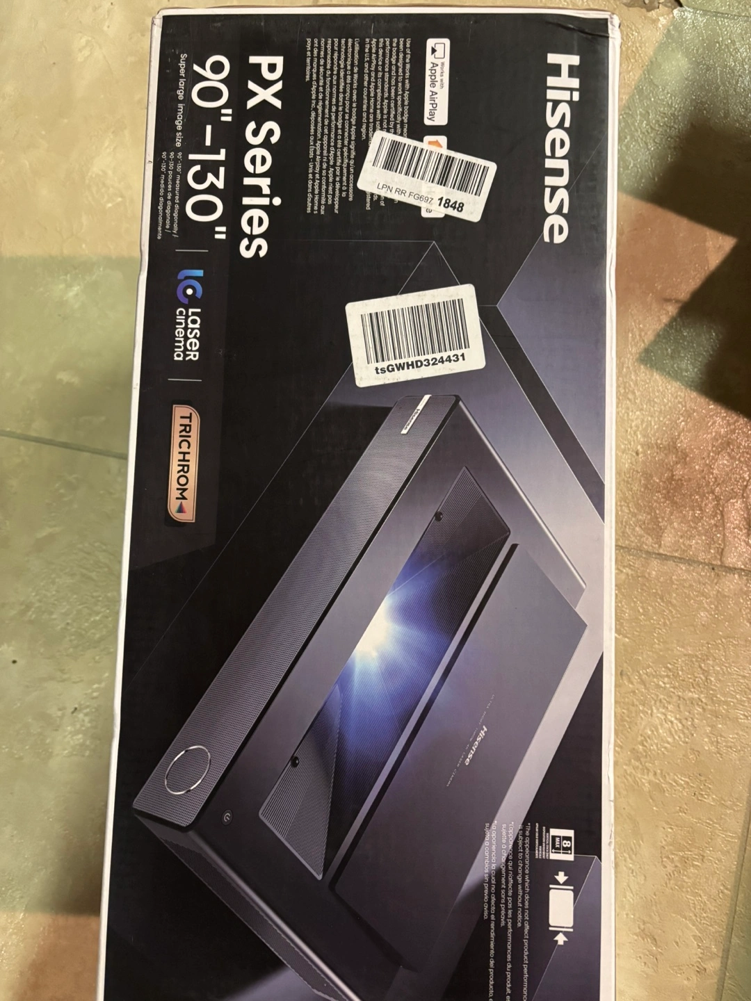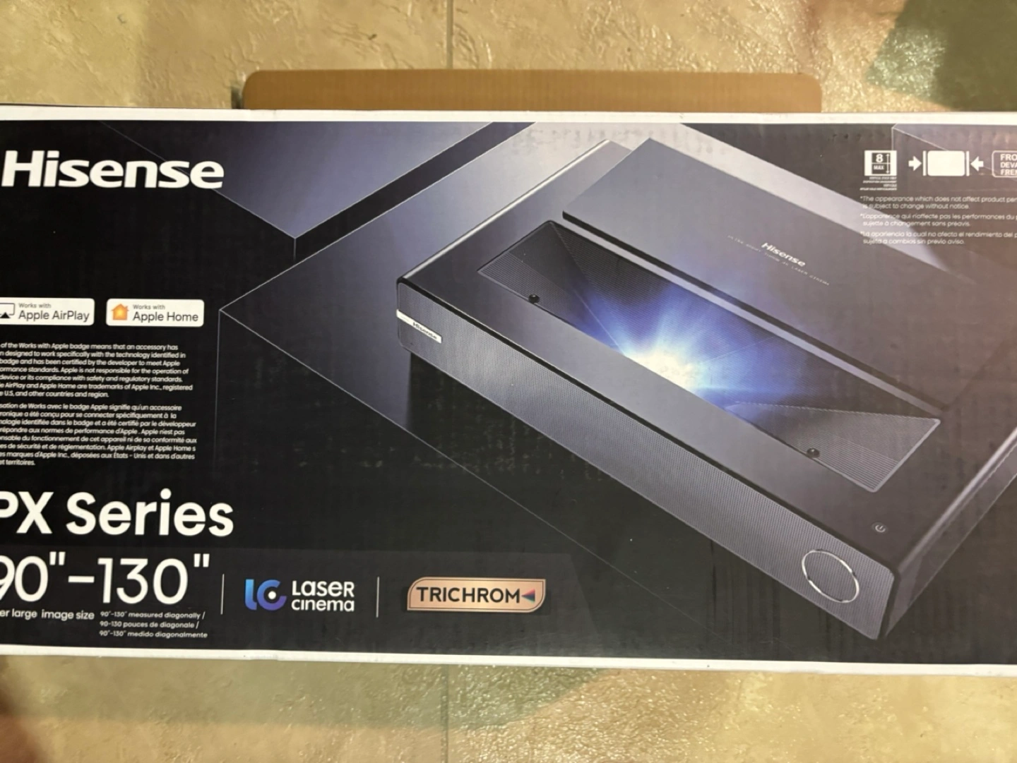 New in box. Includes remote and accessories. Laser cinema projector. 90-130 inch image size.