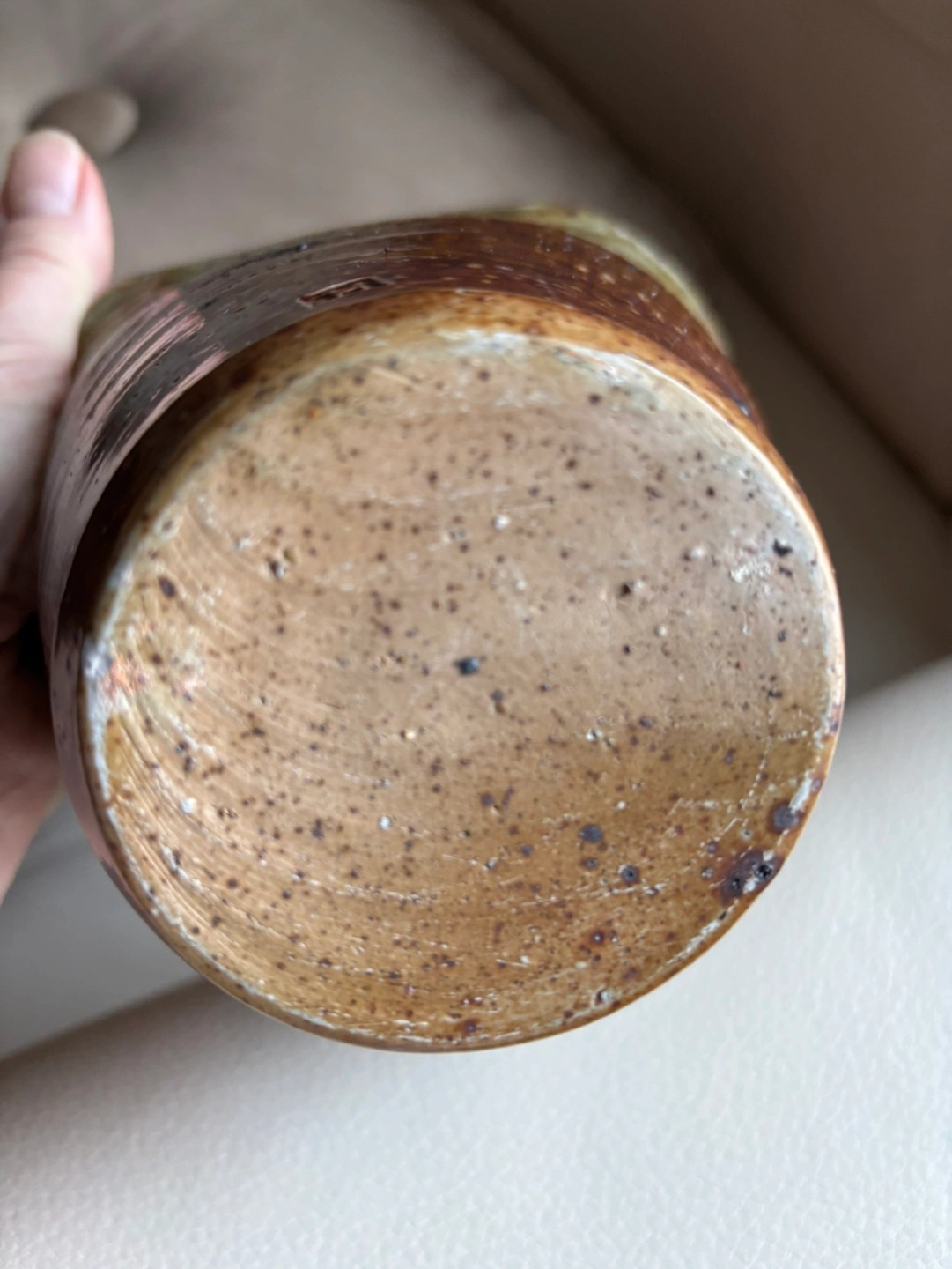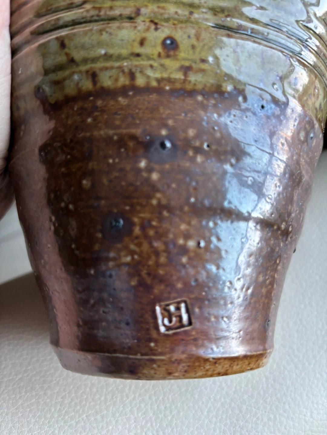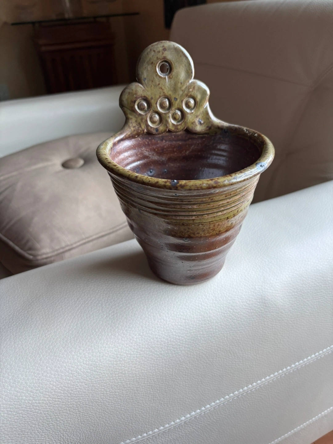 Unique handmade pottery wall planter. Features a decorative top handle and speckled brown and green glaze. Small, perfect for small plants or other items.