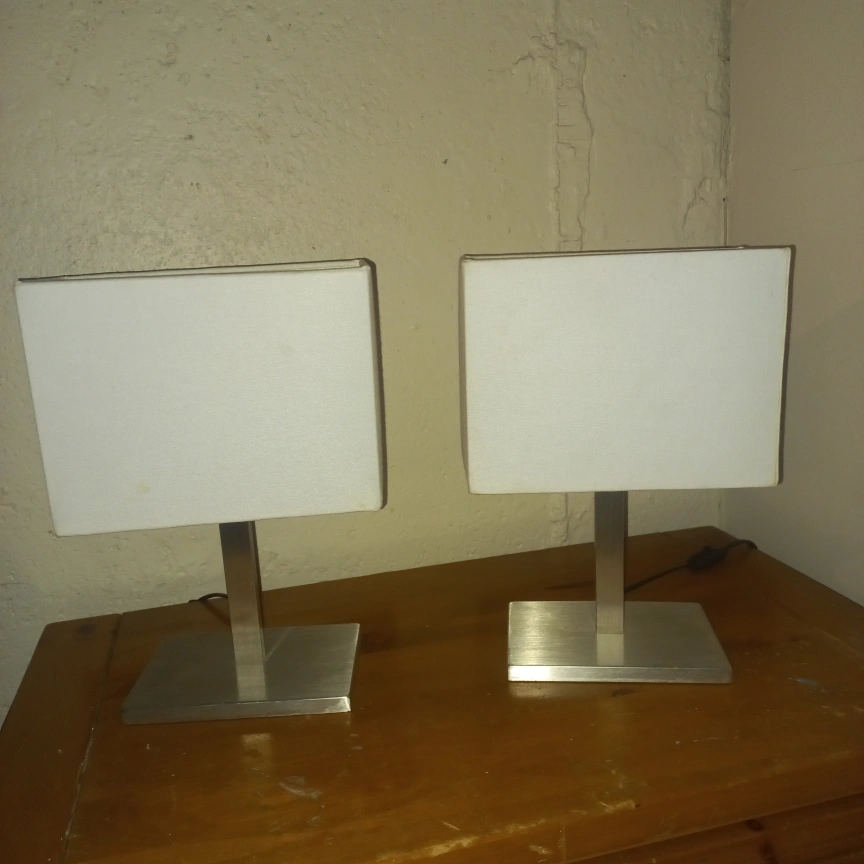 Set of two contemporary table lamps. Brushed stainless steel bases. Simple square white shades. Minimalist design.