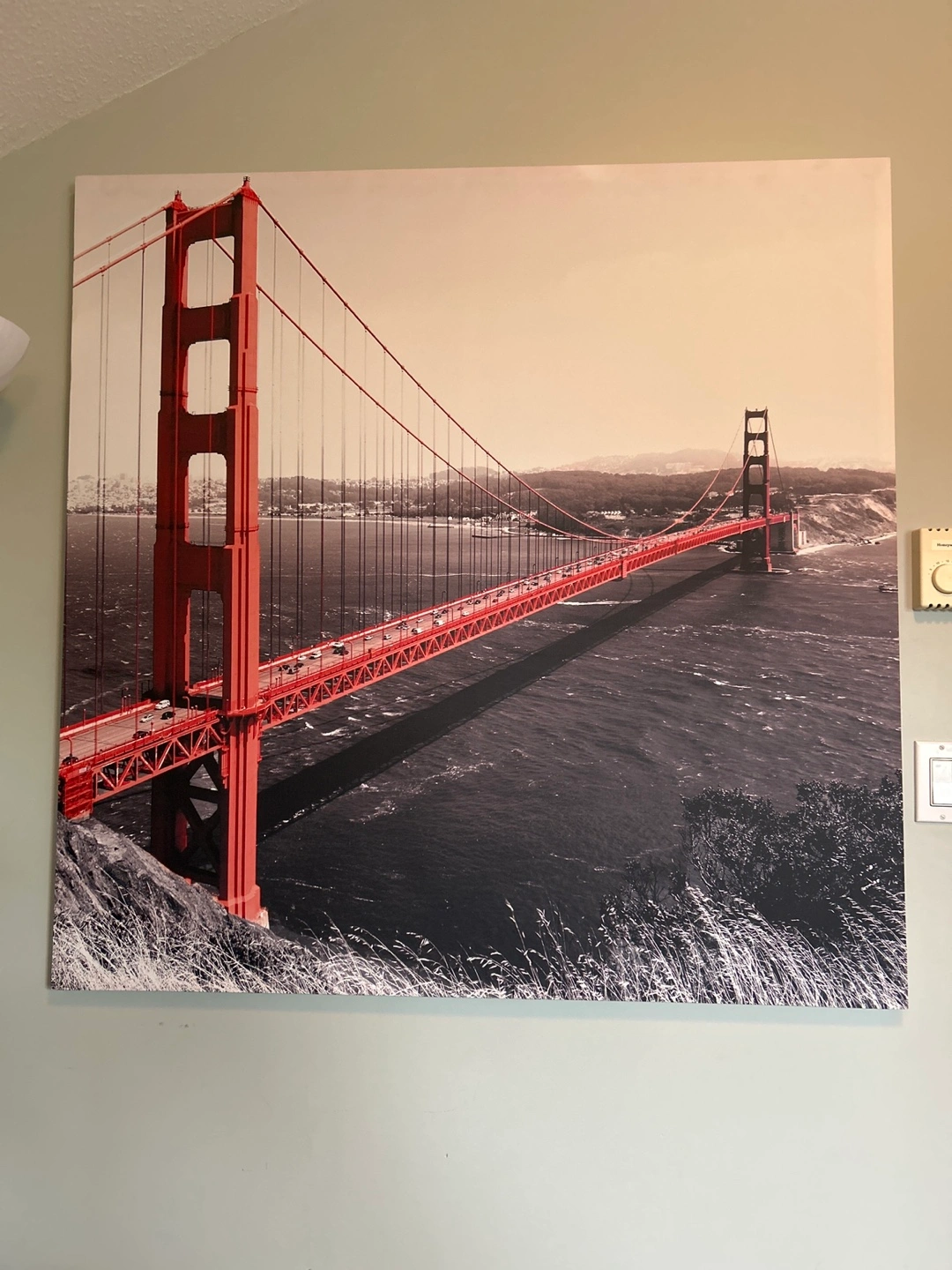 Large square canvas print. Features the Golden Gate Bridge in a sepia tone. Great for adding a touch of California to your home decor.