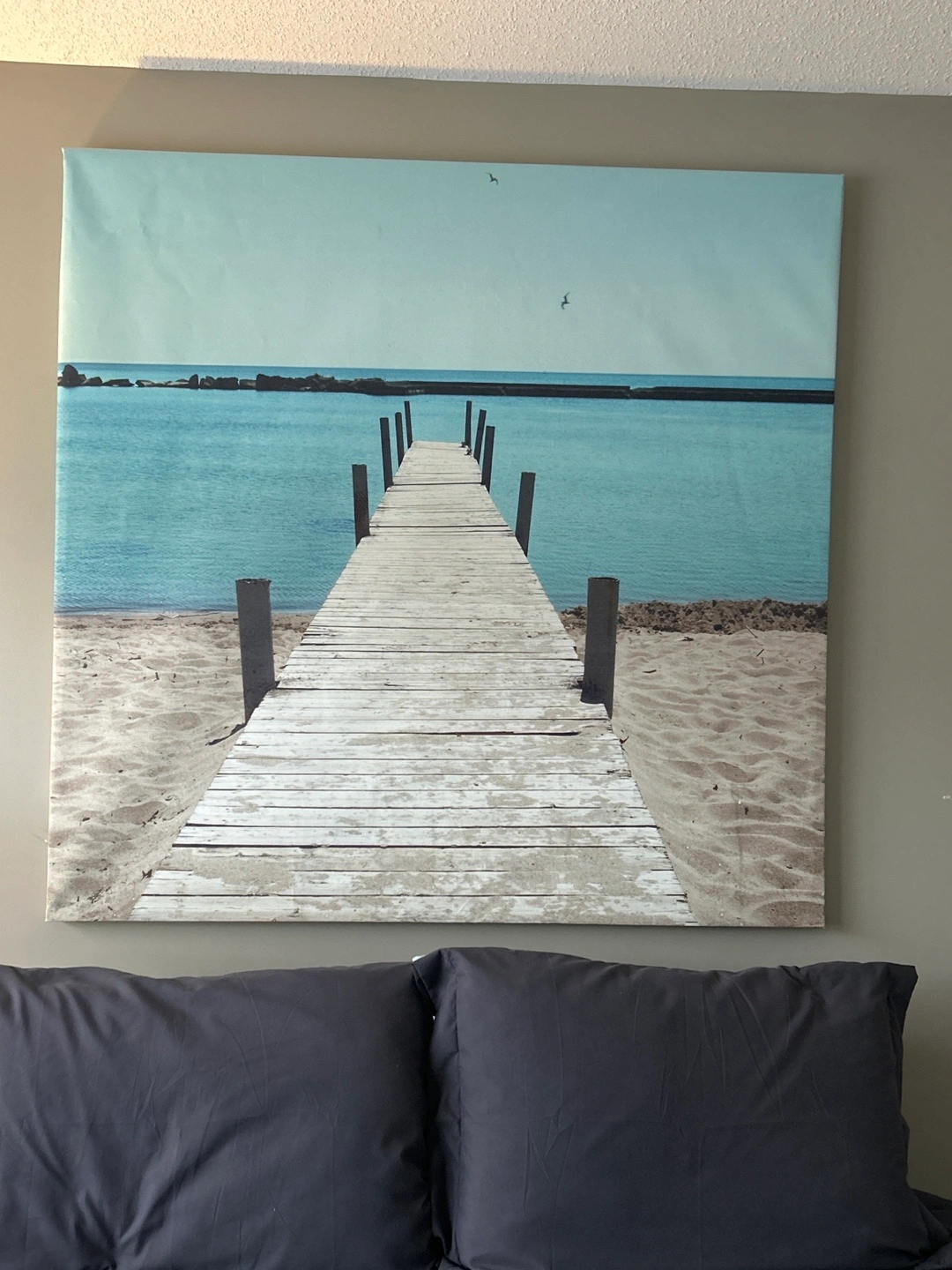 Large canvas print. Features a tranquil beach scene with a wooden dock extending into the ocean. Perfect for adding a calming touch to any room.