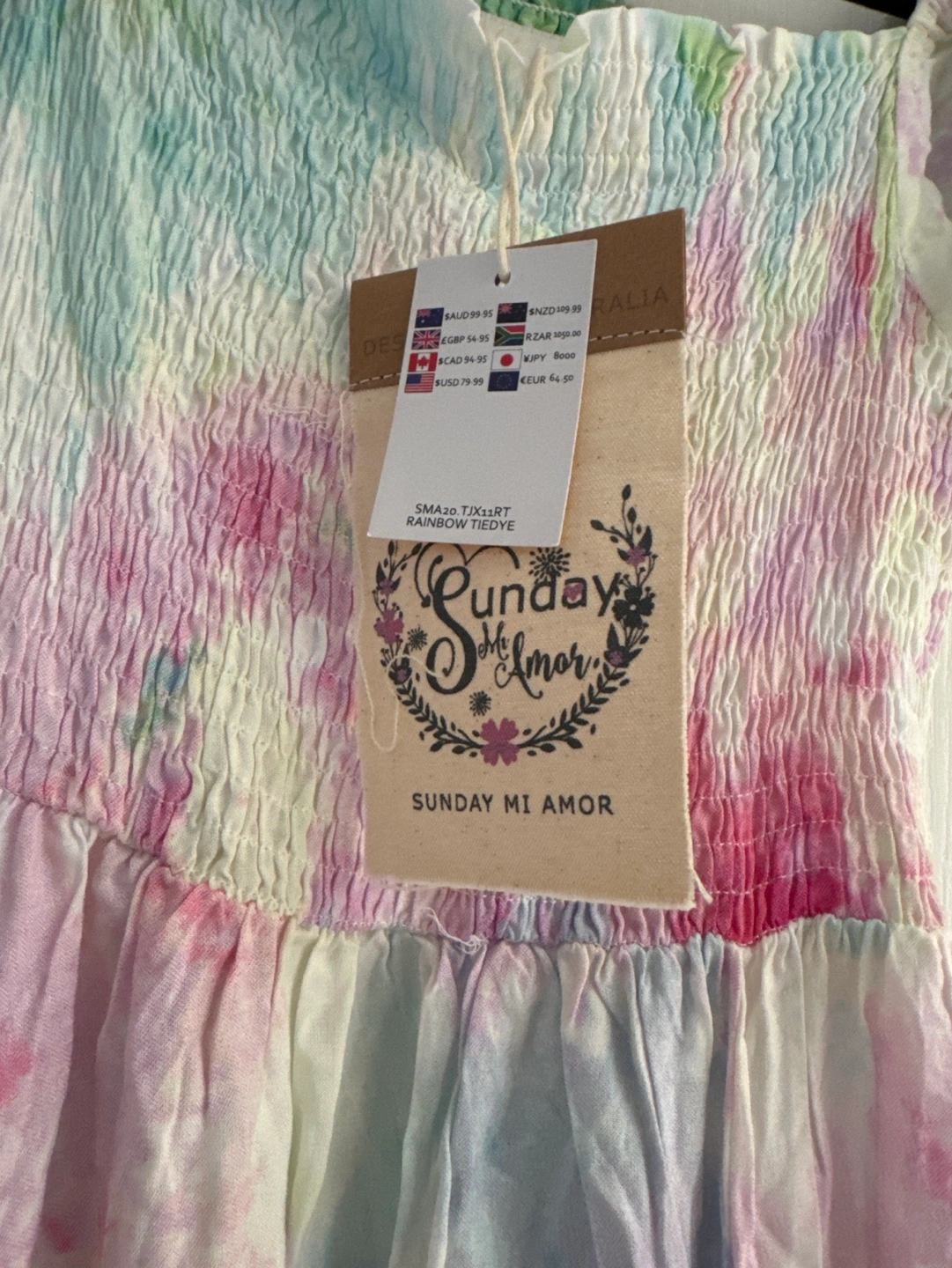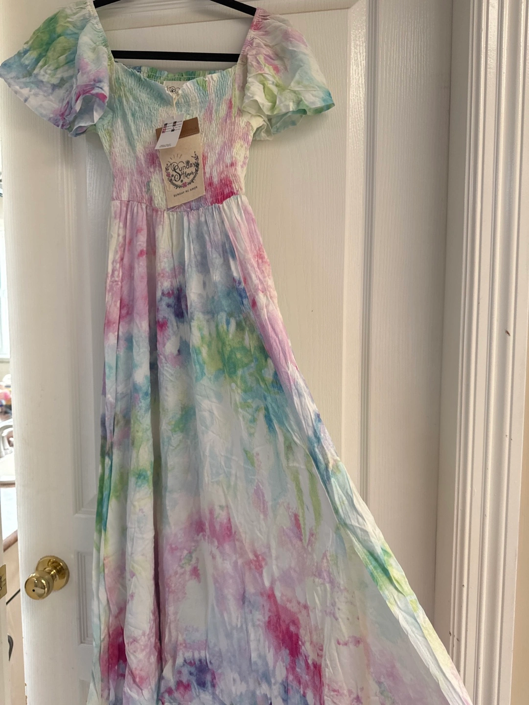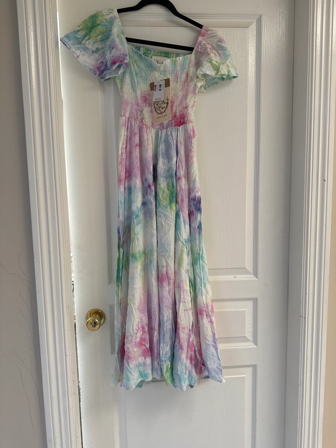 Beautiful maxi dress. Features a smocked bodice, short flutter sleeves, and a flowy skirt. Tie-dye pattern in pastel colours. New with tags. Pickups only in Burnaby at 2nd street school