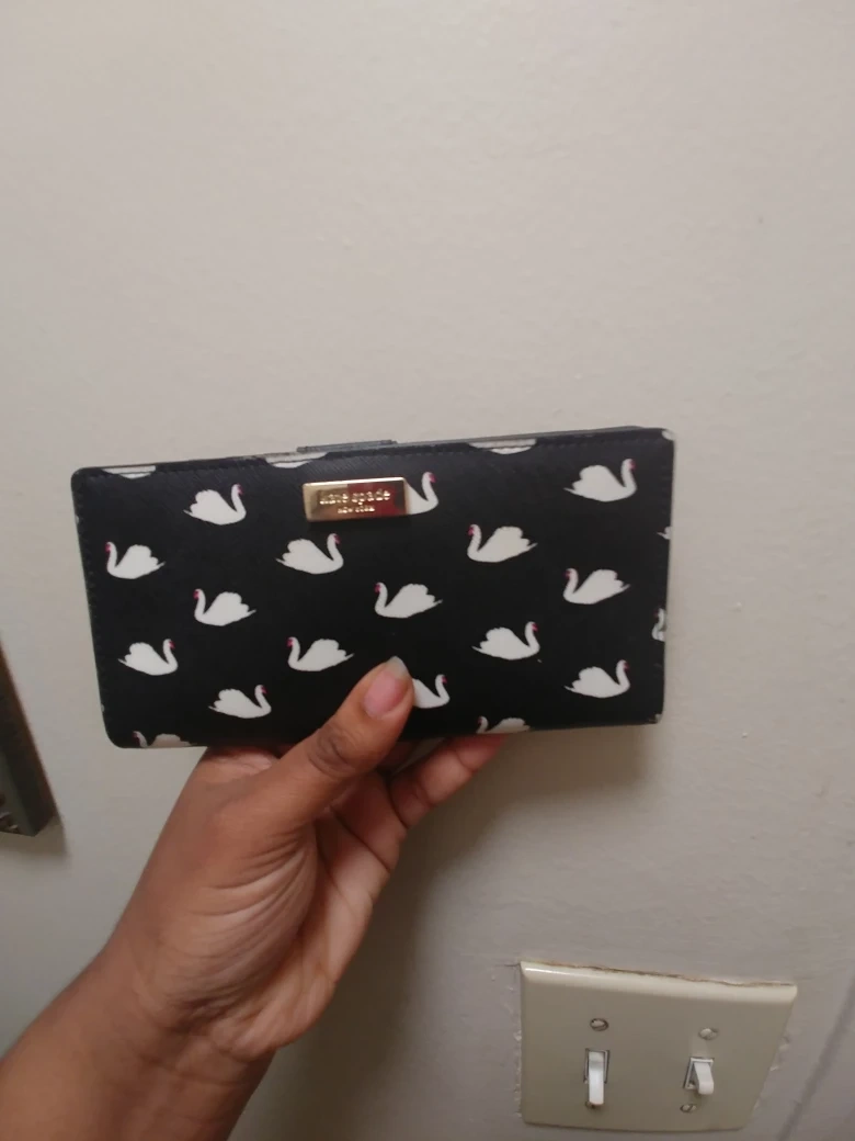 Adorable Kate Spade wallet. Black with white swan print. Multiple card slots and a clear ID window. Great for everyday use. price is firm. pick up midland and Danforth or Young bloor or 401 bay street or runnymede stn