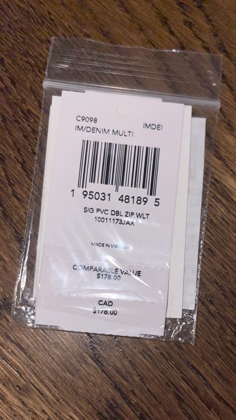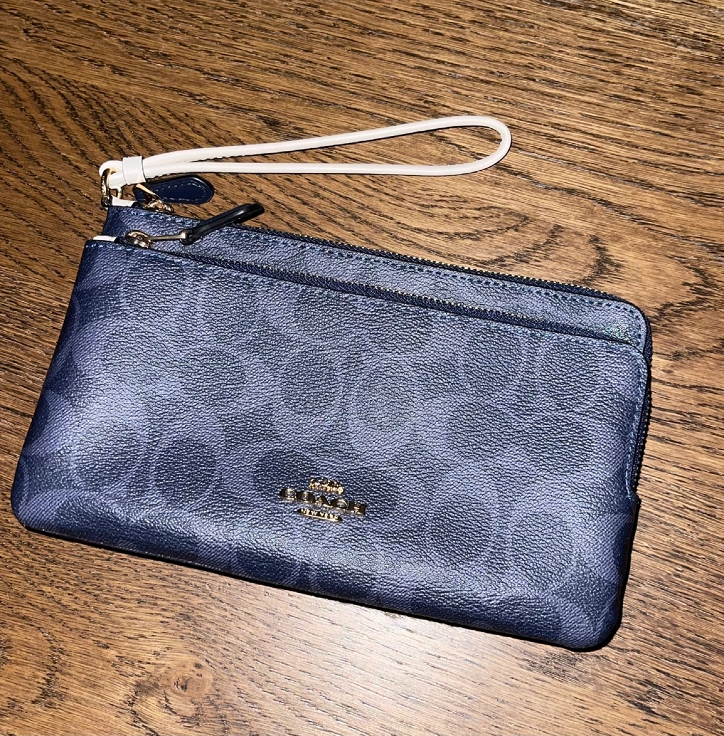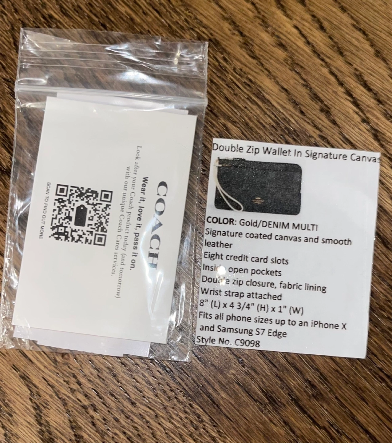 Coach wallet. Double zip closure. Eight credit card slots. Wrist strap attached. Fabric lining. Fits most phones. Style No. C9098.