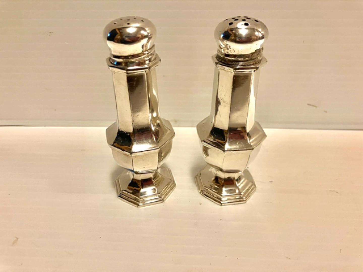 Pair of vintage silver plated salt and pepper shakers. Octagonal base, elegant design. Perfect for adding a touch of vintage charm to your table.
