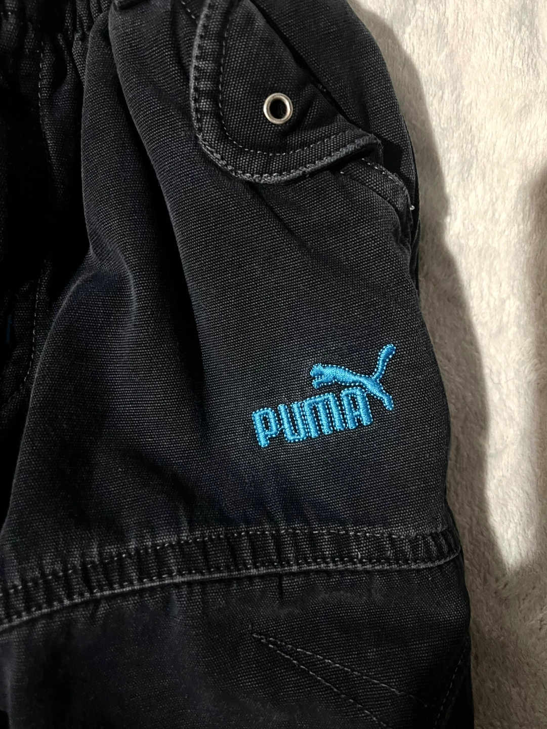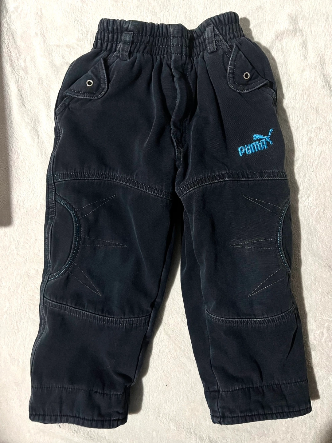 32Dark navy blue baby boy pants. Elastic waistband. Two pockets. Embroidered Puma logo. Size 18 months. Pick up only