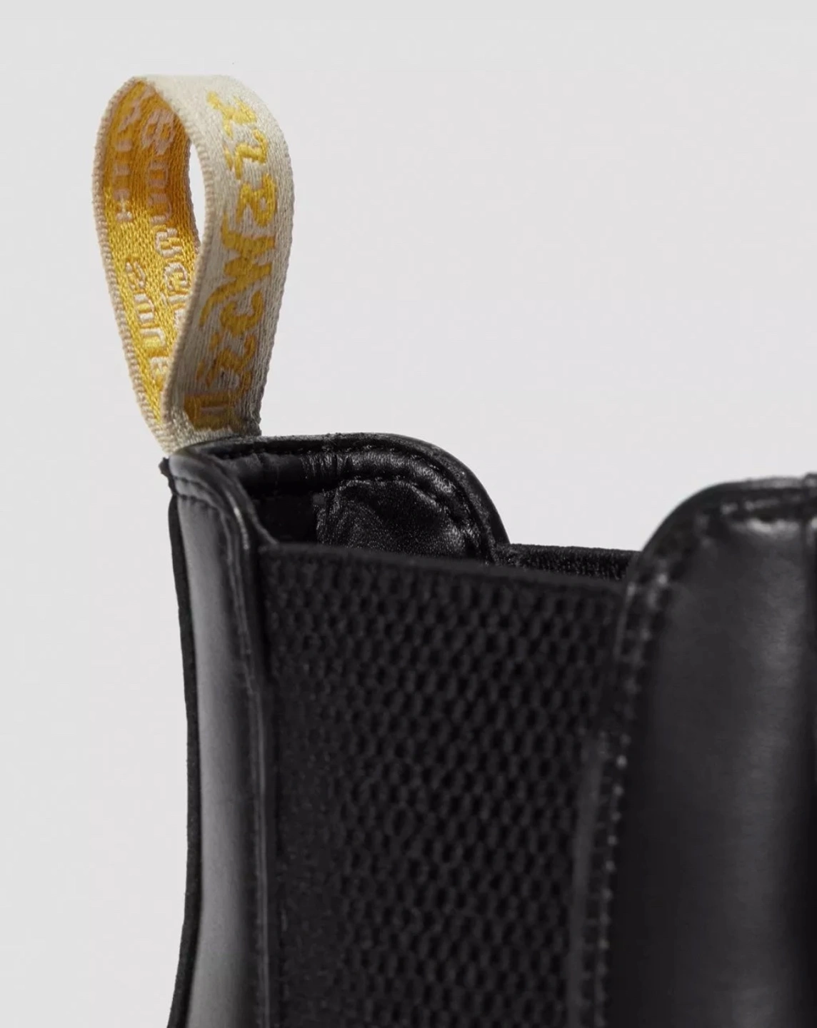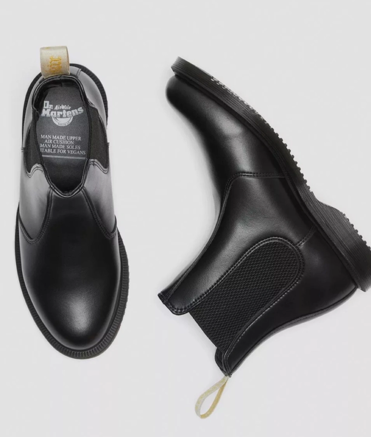 The Flora is a sleek, feminine Chelsea boot with a slim profile and elastic gussets for easy pull-on style — and black synthetic material for a 100% vegan construction (indicated by the yellow heel-loop).