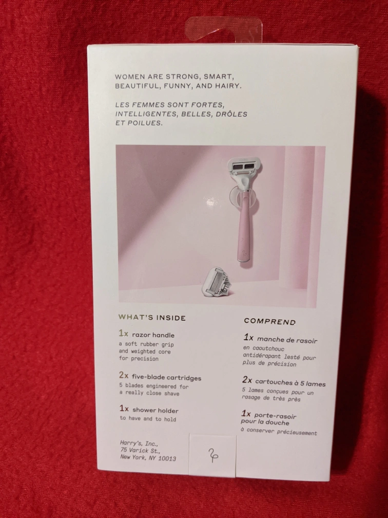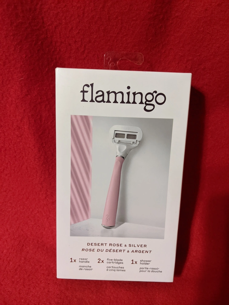 New Flamingo razor. Includes razor handle, two five-blade cartridges, and shower holder. Pink handle, silver accents. Rose gold colour.
