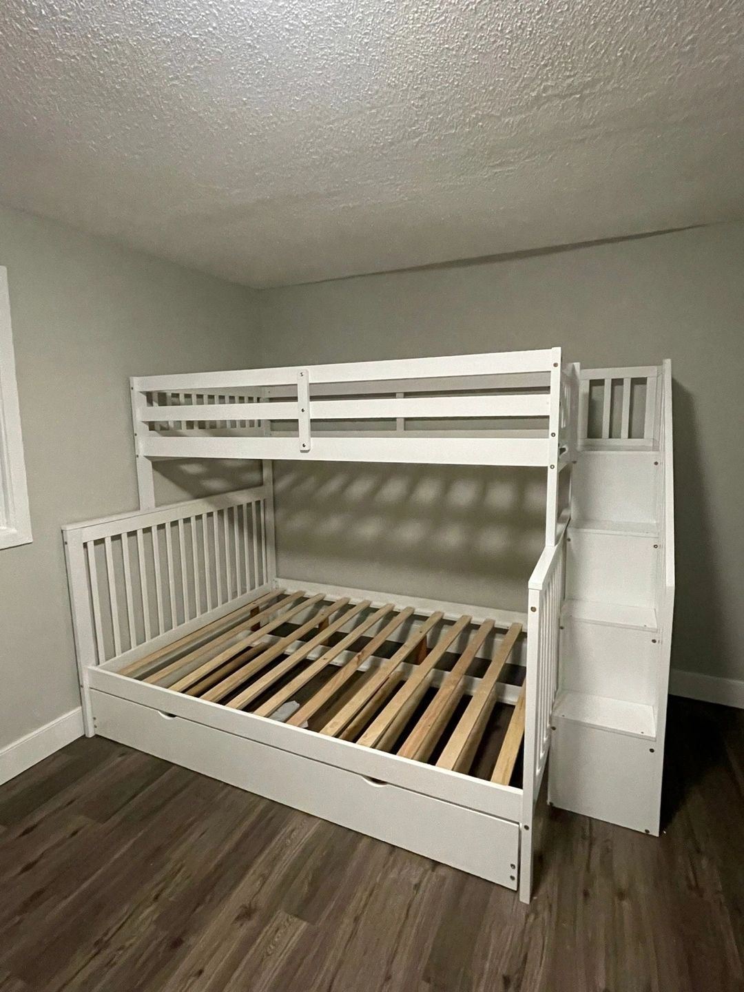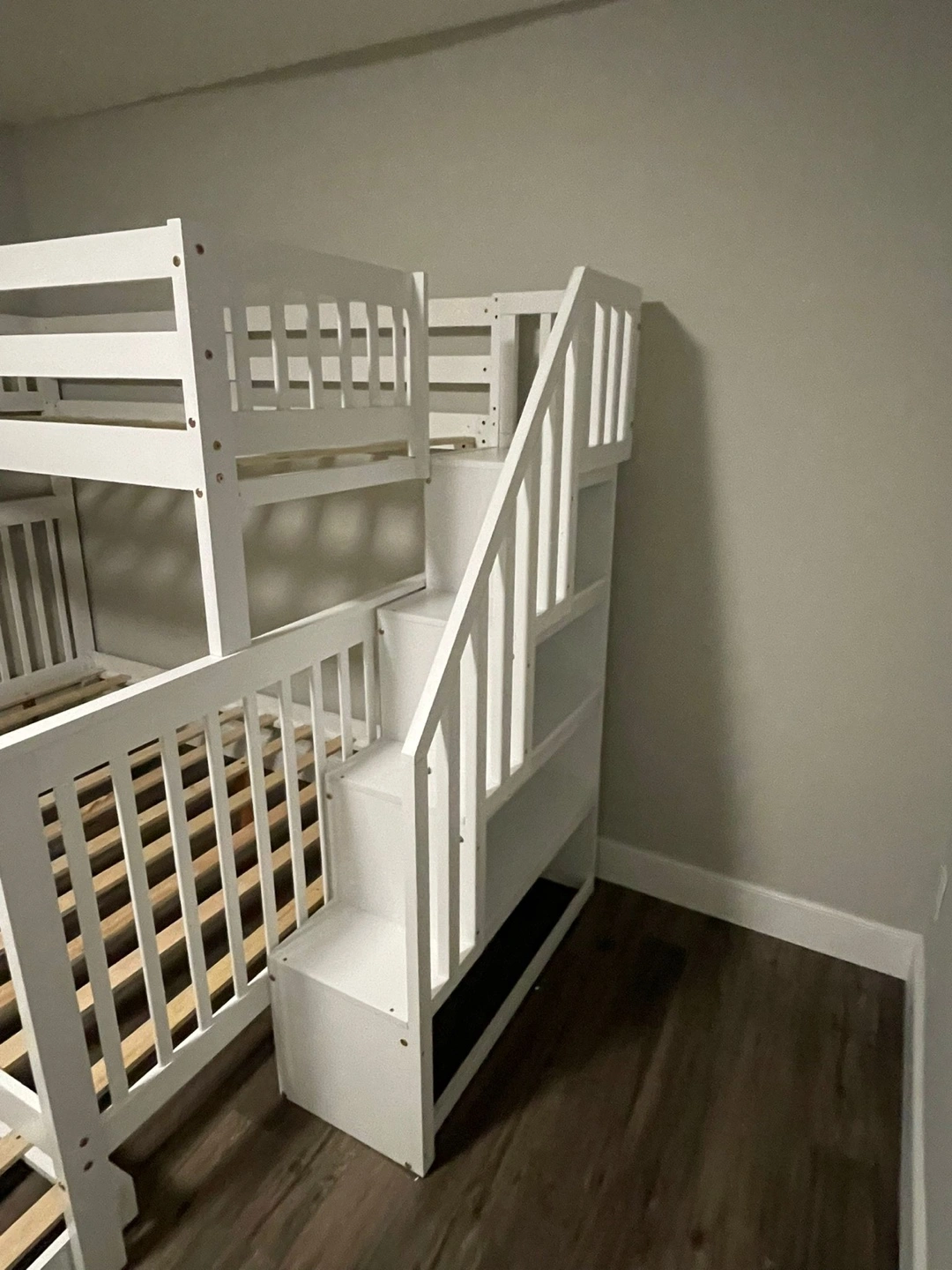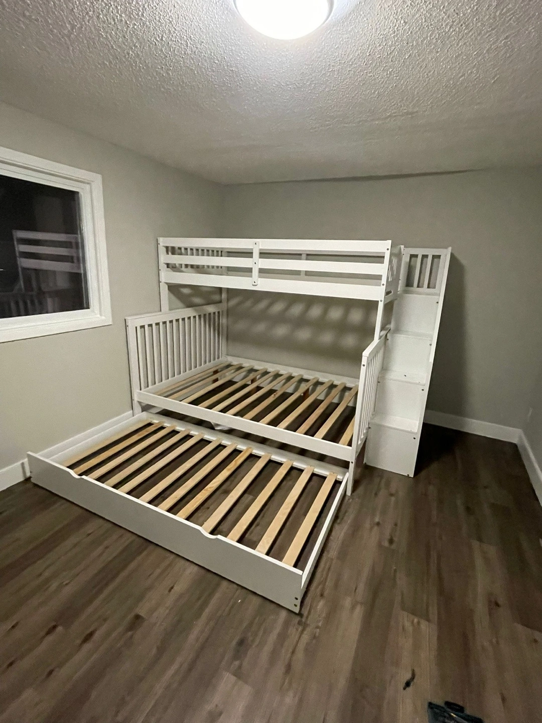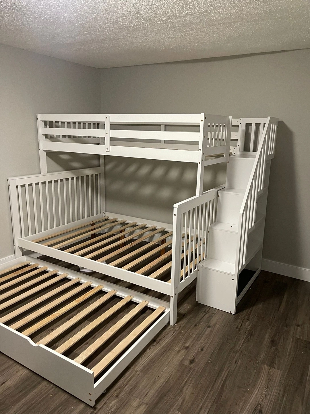 Triple bunk bed, white finish. Includes a trundle and integrated stairs. Solid wood construction. assembly required.