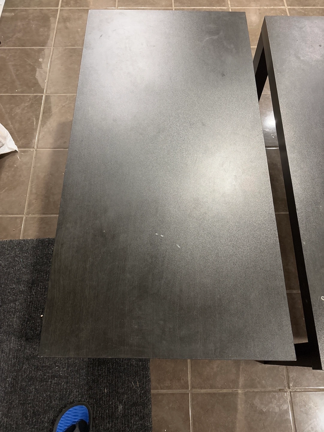 Ikea black coffee table, simple design. Slight wear and tear visible on the surface. Good for a small space or apartment. Easy to assemble and disassemble.