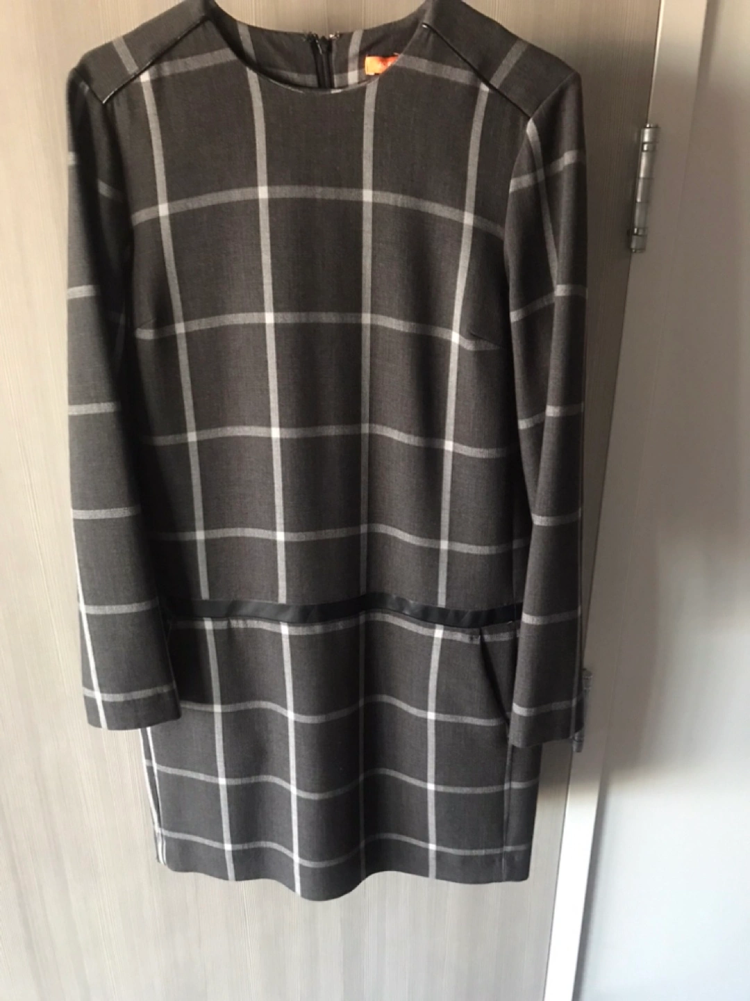 Grey checked pattern. Features black accent at the waist and shoulders. Side pockets. Round neckline.