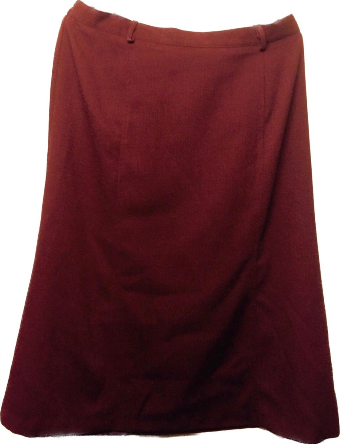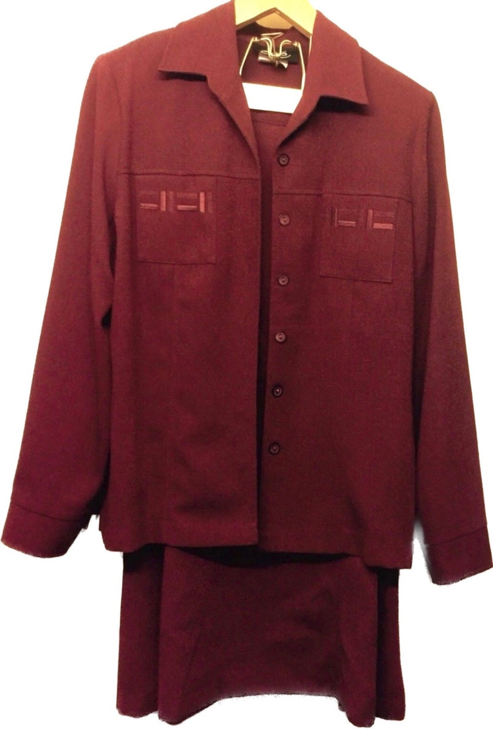 Beautiful burgundy skirt suit. Long-sleeved button-down jacket and A-line skirt. Made in Canada. 100% polyester.