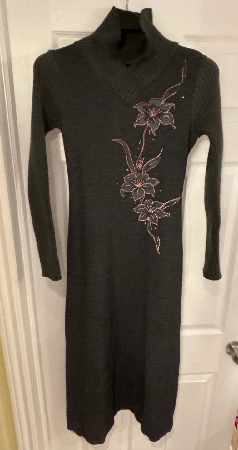 Dark Green Knit Mock Neck Midi Dress with Floral Detail