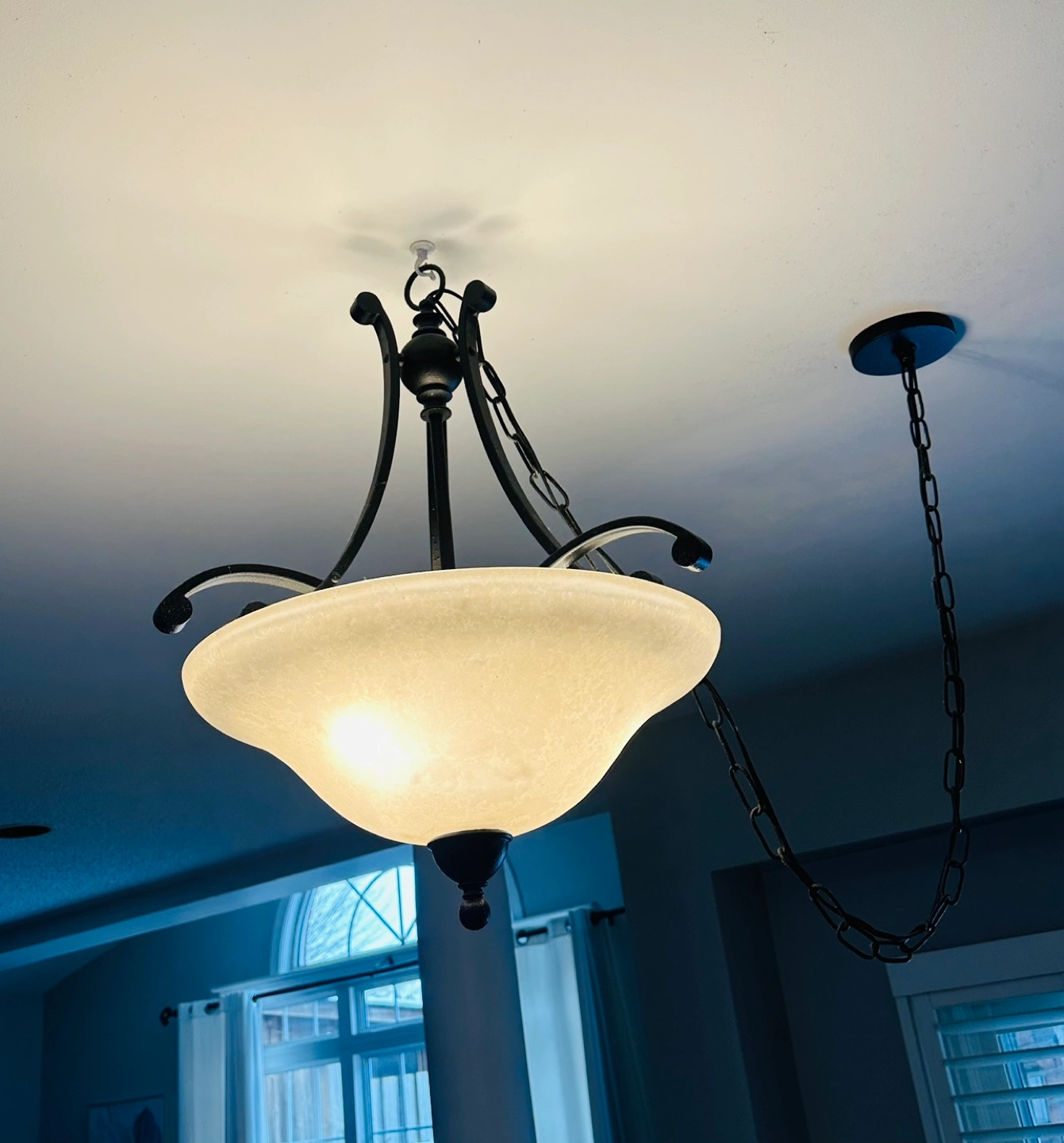 Beautiful chandelier. Features a frosted glass shade and dark bronze finish. Includes hanging chain. Great for dining room or living room.