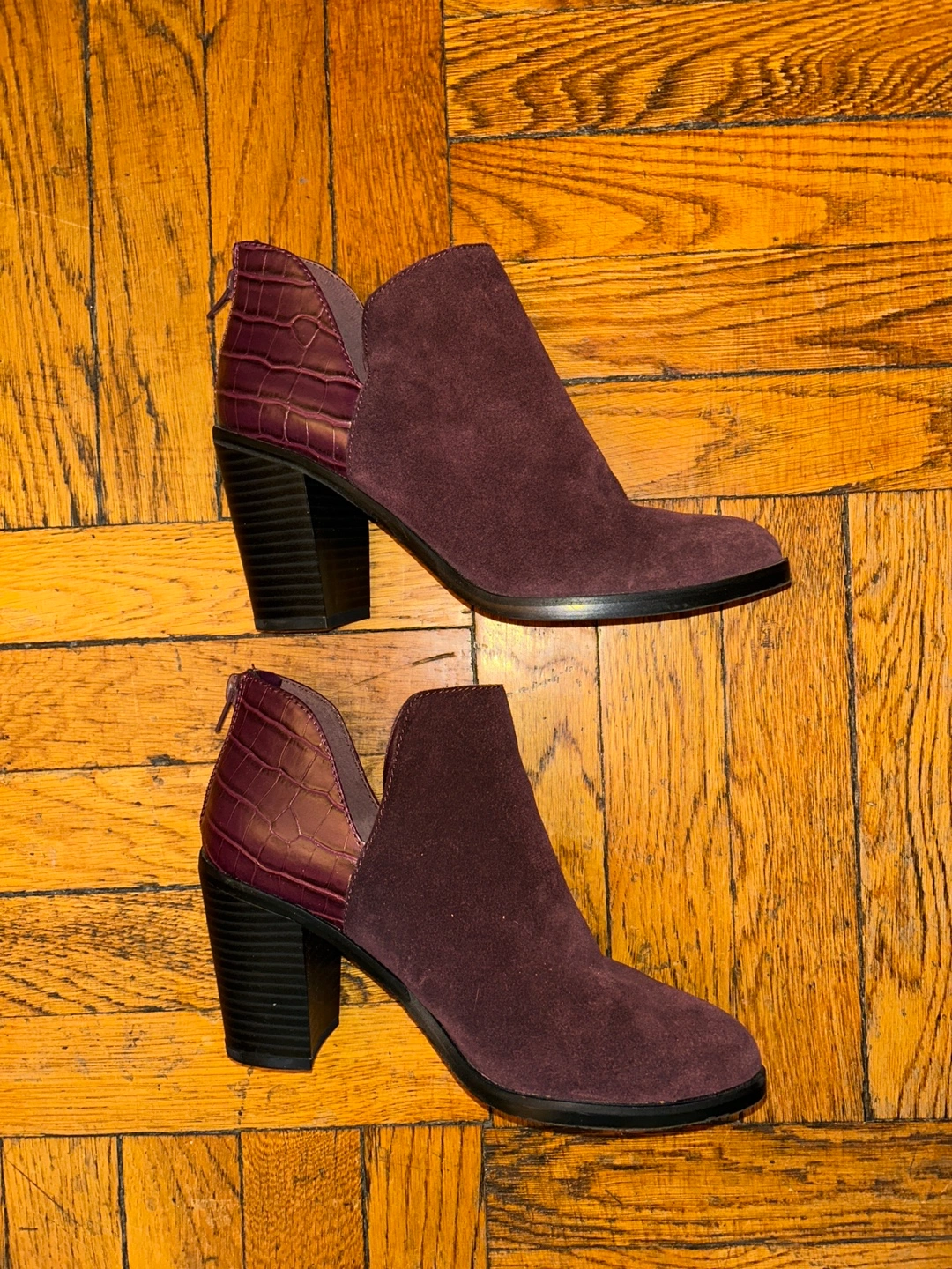 Women's Dolce Vita burgundy suede ankle boots. Features a 3” block heel and side cutouts. Crocodile-embossed leather detailing on the sides. Zipper closure on the back. Like new condition