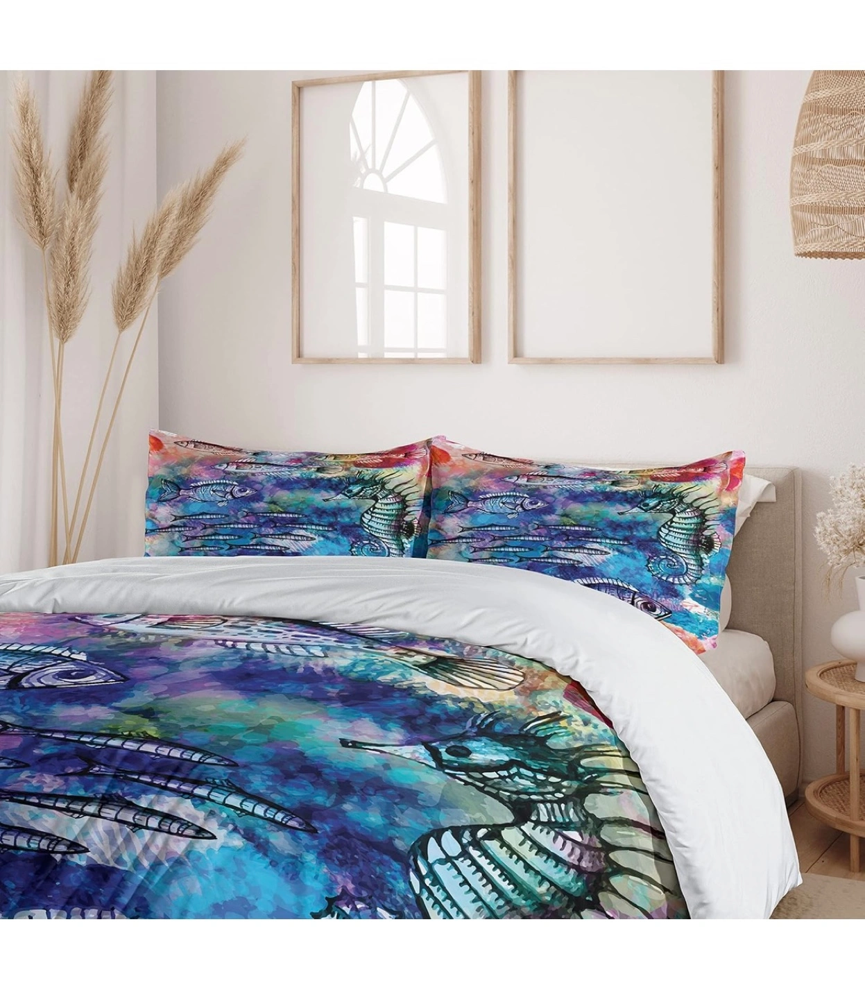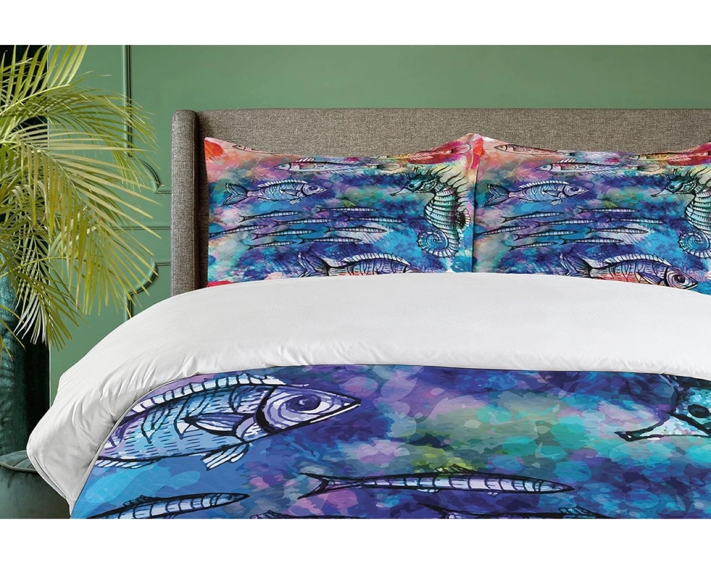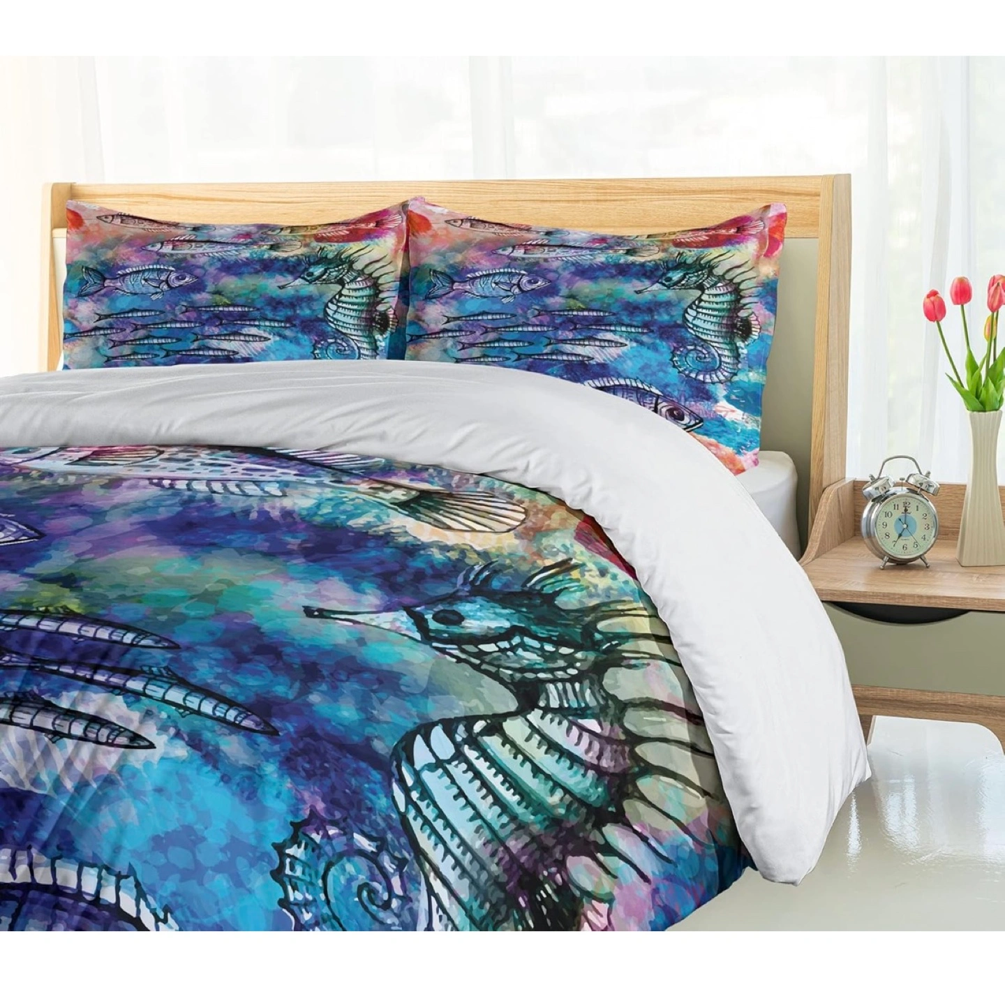 Beautiful duvet cover set. Features a watercolour design of seahorses and various fish. Includes a duvet cover and two pillowcases. Vibrant colours and unique artistic style. Perfect for adding a touch of ocean magic to your bedroom.