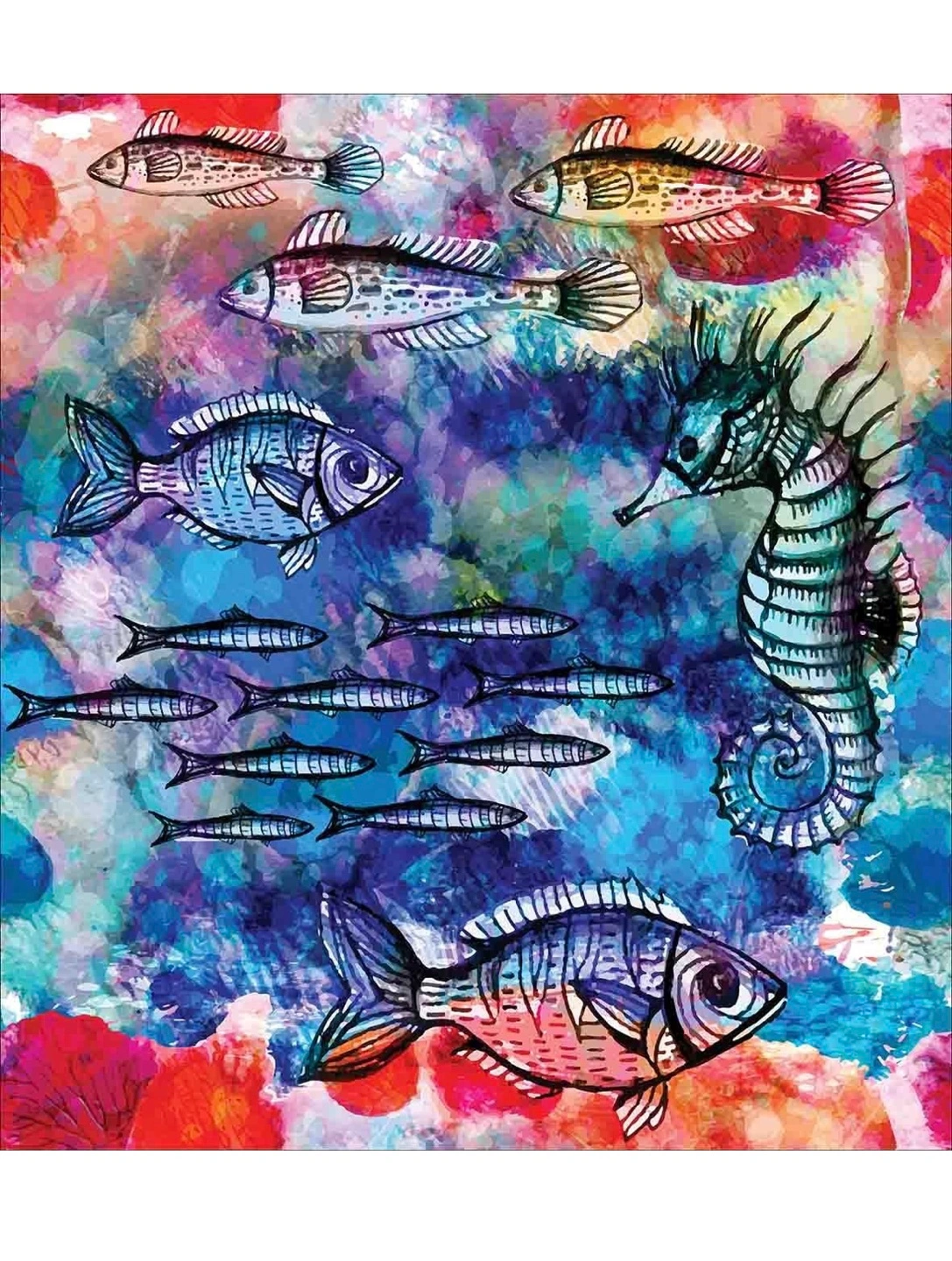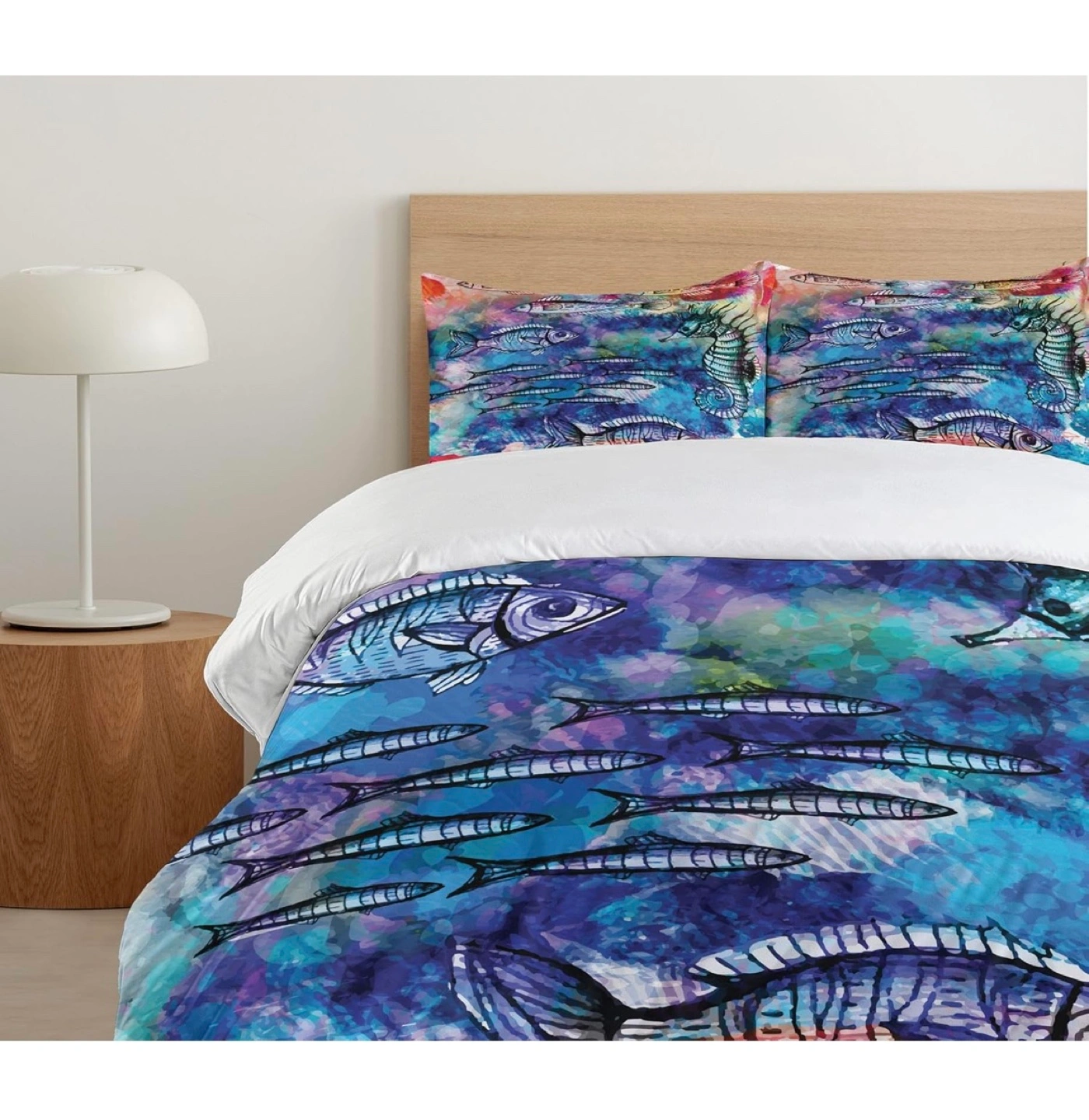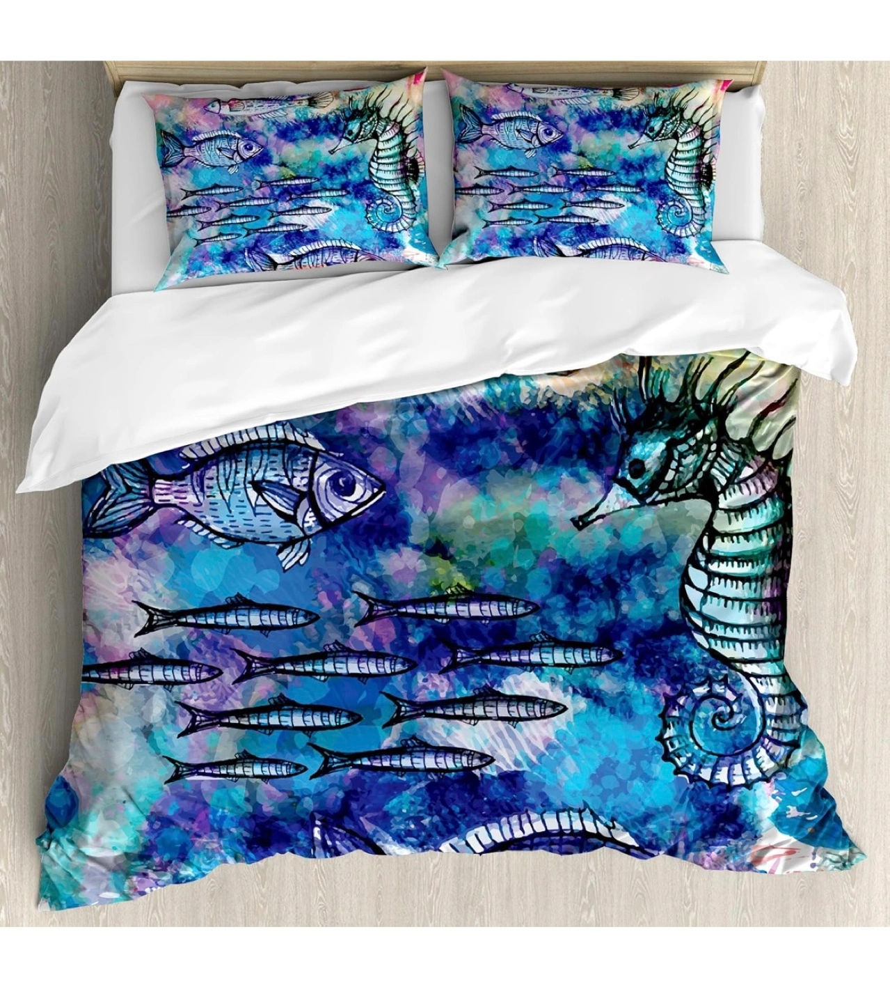 Beautiful duvet cover set. Features a watercolour design of seahorses and various fish. Includes a duvet cover and two pillowcases. Vibrant colours and unique artistic style. Perfect for adding a touch of ocean magic to your bedroom.