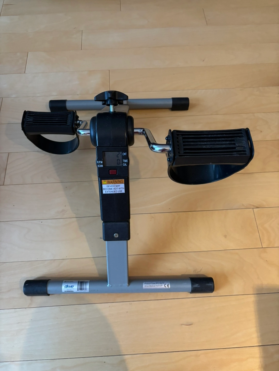 Used manual pedal exerciser. Features adjustable resistance. Includes digital display showing time, calories, and RPM. Compact and easy to store.