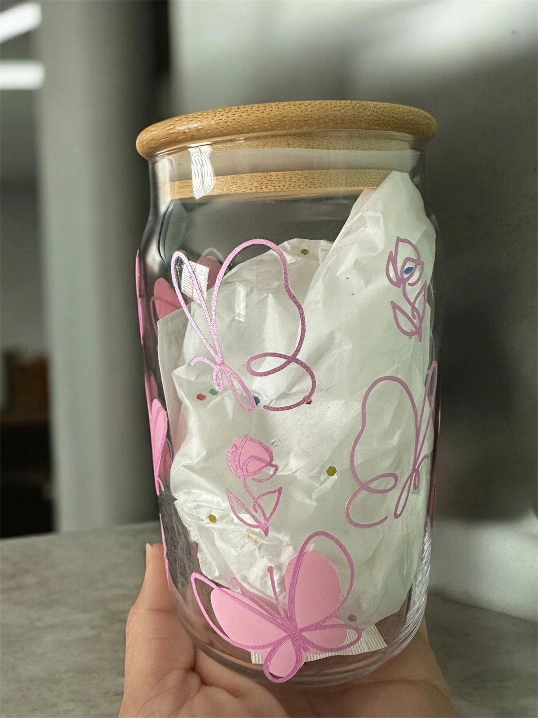 Glass jar with bamboo lid, Ramadan and butterfly designs