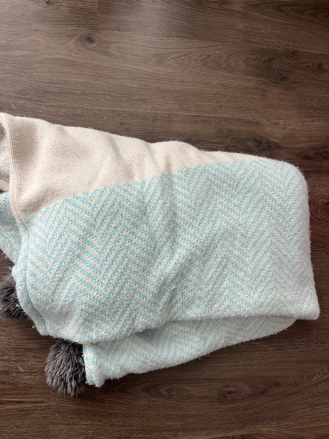 Cream and light blue chevron patterned knit throw blanket. Features a sherpa fleece backing and three grey pom-poms. Gently used.