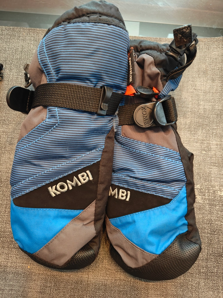Pair of boys size large waterproof snow mittens. Blue and grey colour scheme. Adjustable wrist straps. Great for winter outdoor activities in fantastic condition. From a smoke free pet free home.