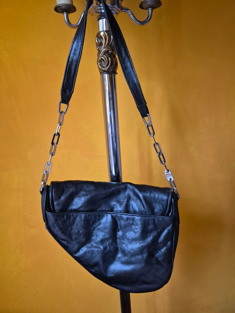 Black leather saddle bag. Features a chain, in pocket, fabric lining and leather strap. Slight wear but casual luxury like the Dior saddle bag. Perfect leather bag for the summer.
