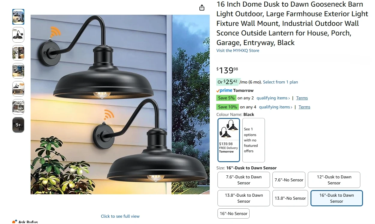 16 Inch Dome Dusk to Dawn Gooseneck Barn Light Outdoor, Large Farmhouse Exterior Light Fixture Wall Mount, Industrial Outdoor Wall Sconce Outside Lantern for House, Porch, Garage, Entryway, Black, Brand New in the Box/Sealed