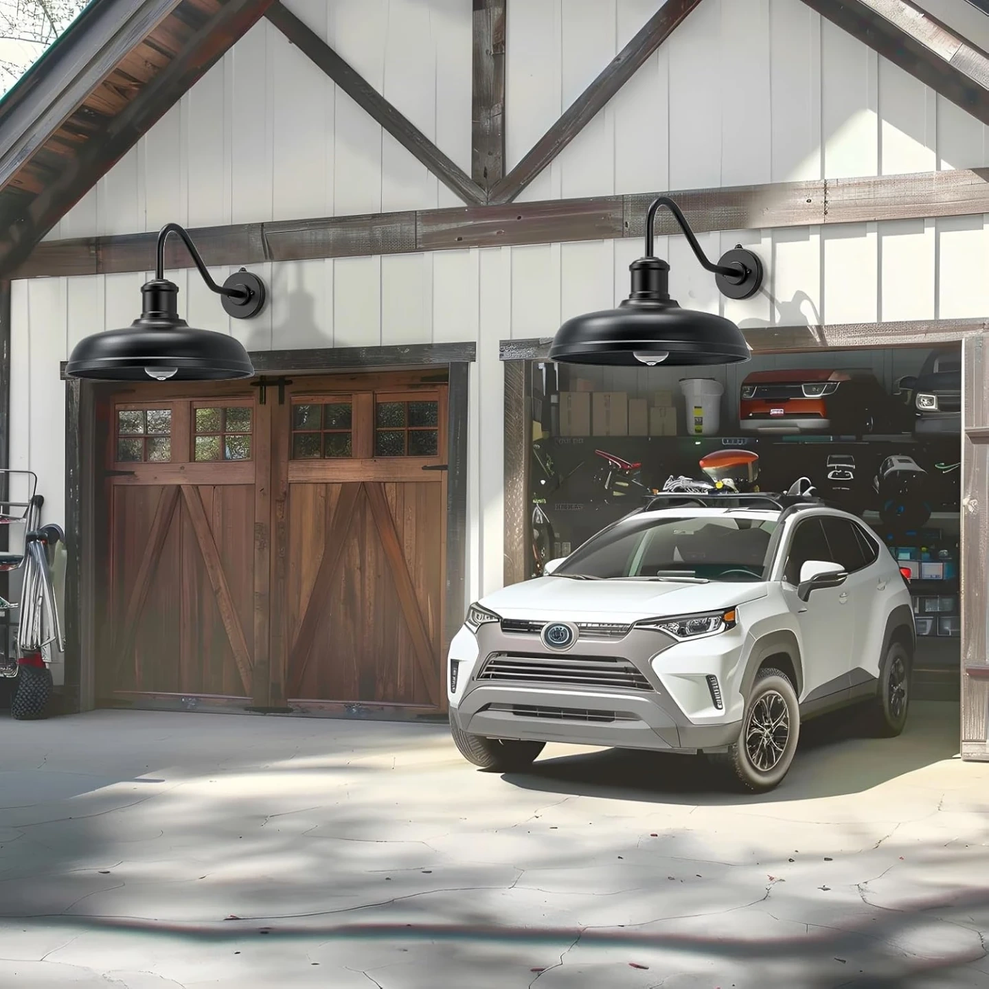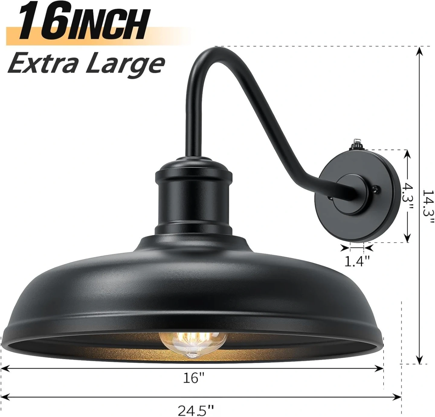 【Extra Large Size Farmhouse Gooseneck Barn Light】 This farmhouse outdoor lighting measures 24.4"L x 16"W x 14.3"H. The dome of the barn light is 16 inches and the mounting back plate diameter is 4.3''. This farmhouse outdoor lighting is ideal for your front door, gardens, garage, front porch, yards, and commercial uses such as overnight security, area lighting, etc.