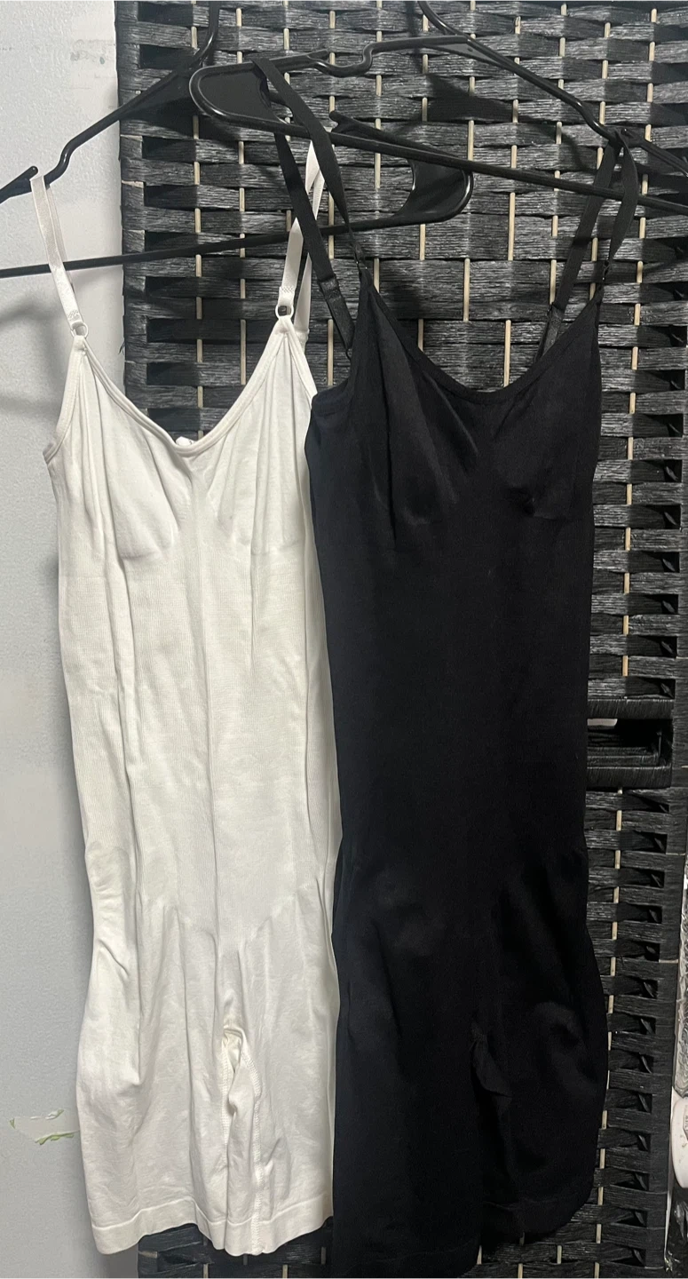 This listing includes two shapewear bodysuits, one in black and one in white. They feature adjustable straps and a comfortable, stretchy fabric. These bodysuits offer light shaping and smoothing under clothing.